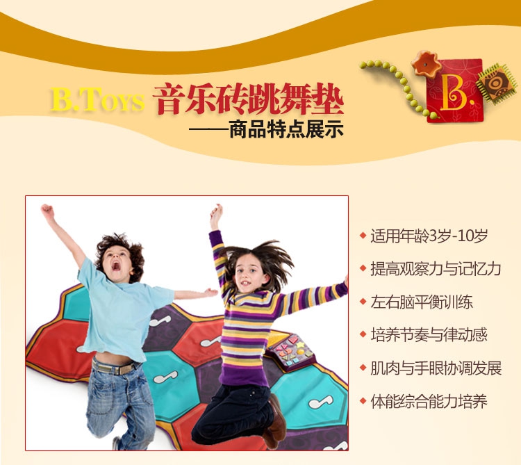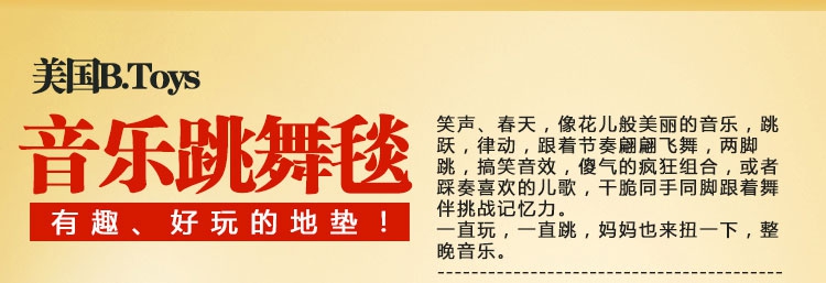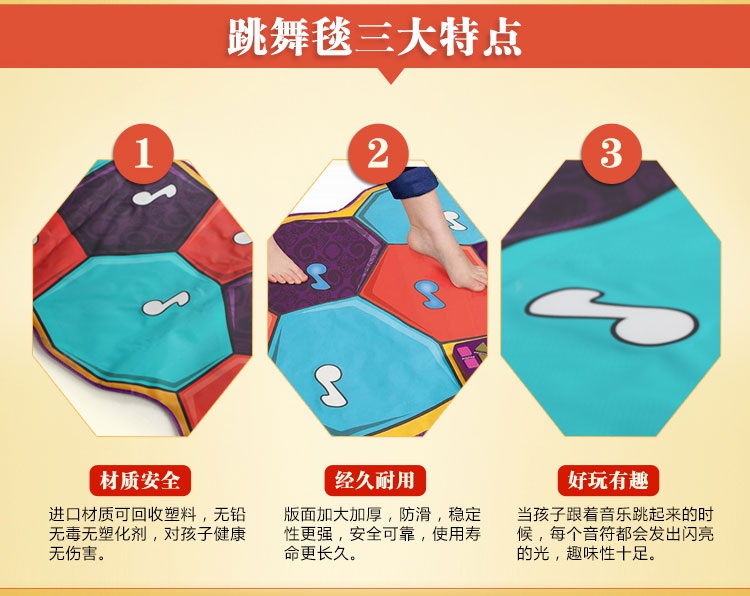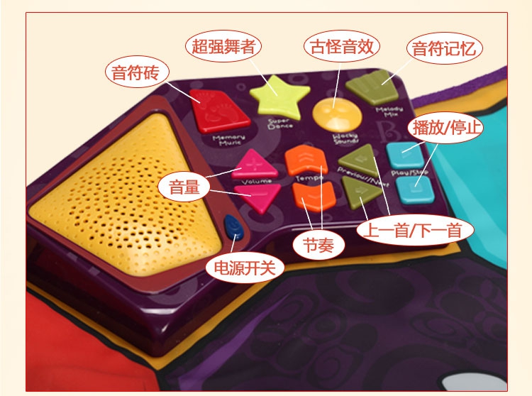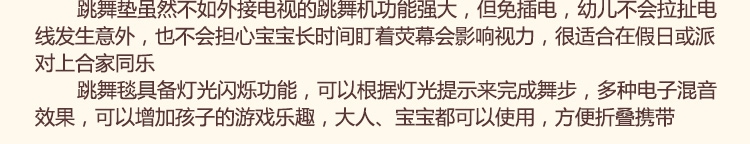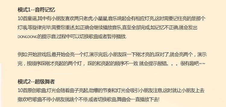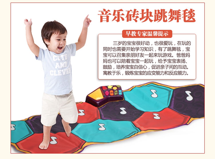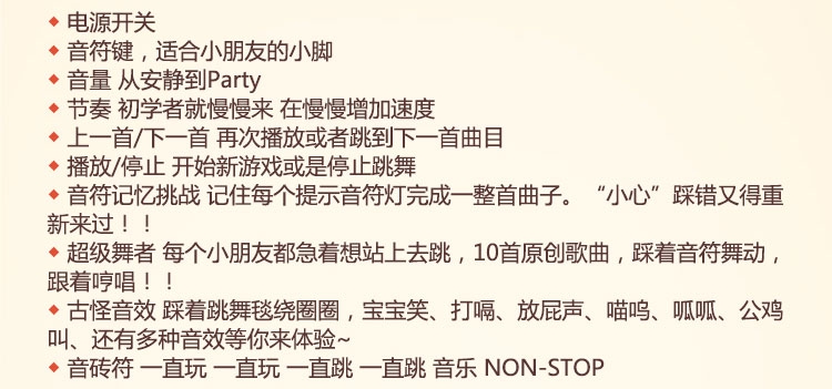 玩具特色:跳舞毯包含多种音乐,随时随地播放音乐,