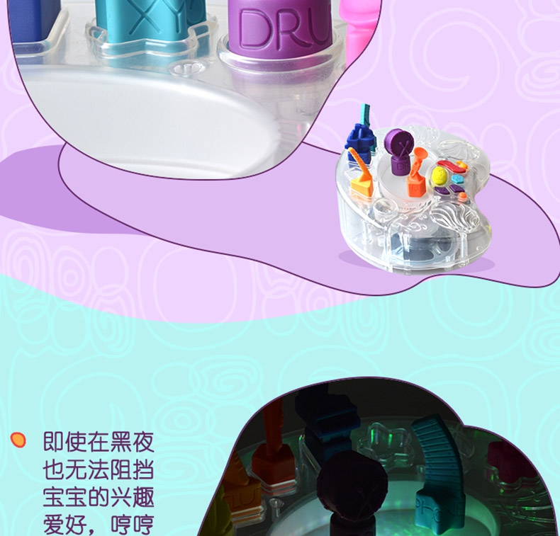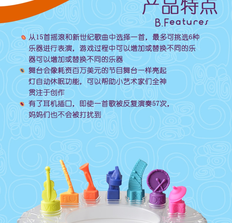 玩具特点:15首歌曲可任选一首放上不同的乐器会播放不同