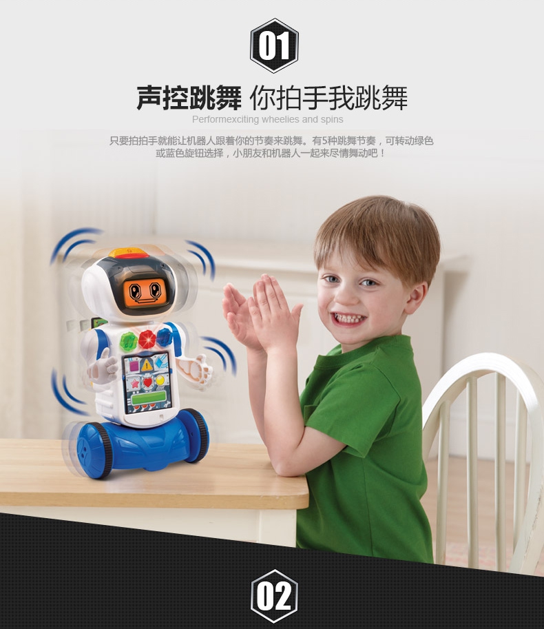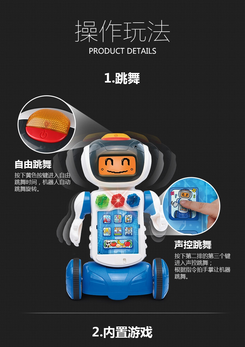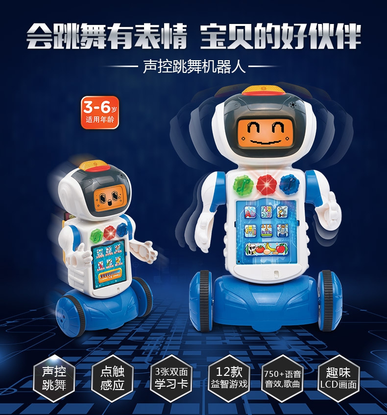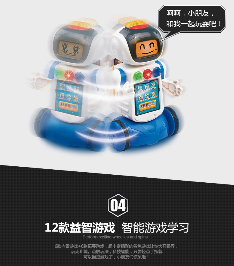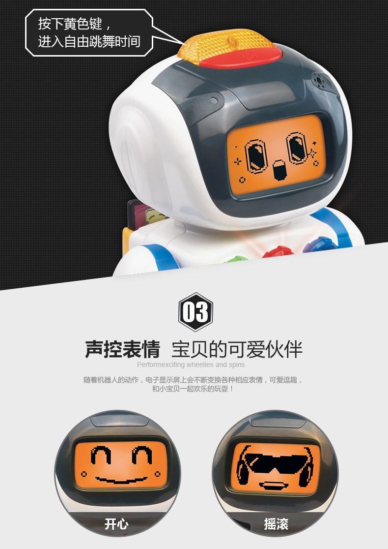 随着机器人动作LED显示屏会有不同表情,和宝宝一起快乐的玩耍
