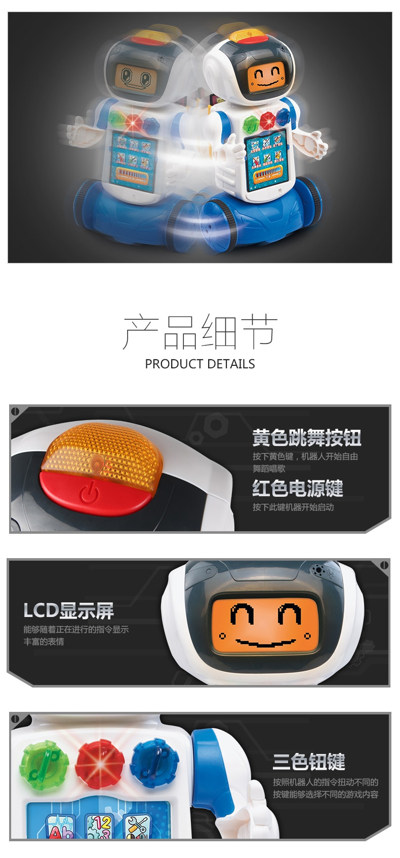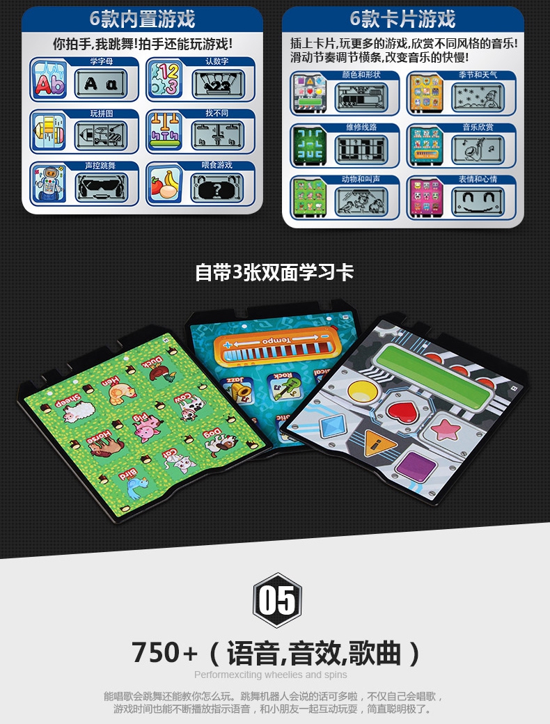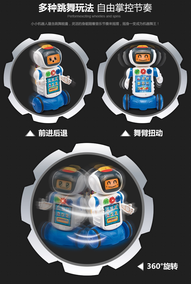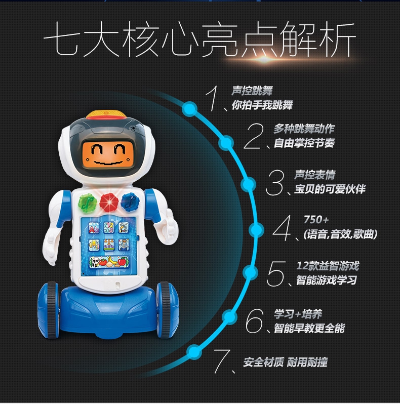 随着机器人动作LED显示屏会有不同表情,和宝宝一起快乐的玩耍