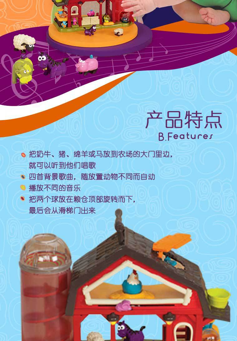 玩具特色:把奶牛、猪、绵阳或马放到农场的大门里边,就可以