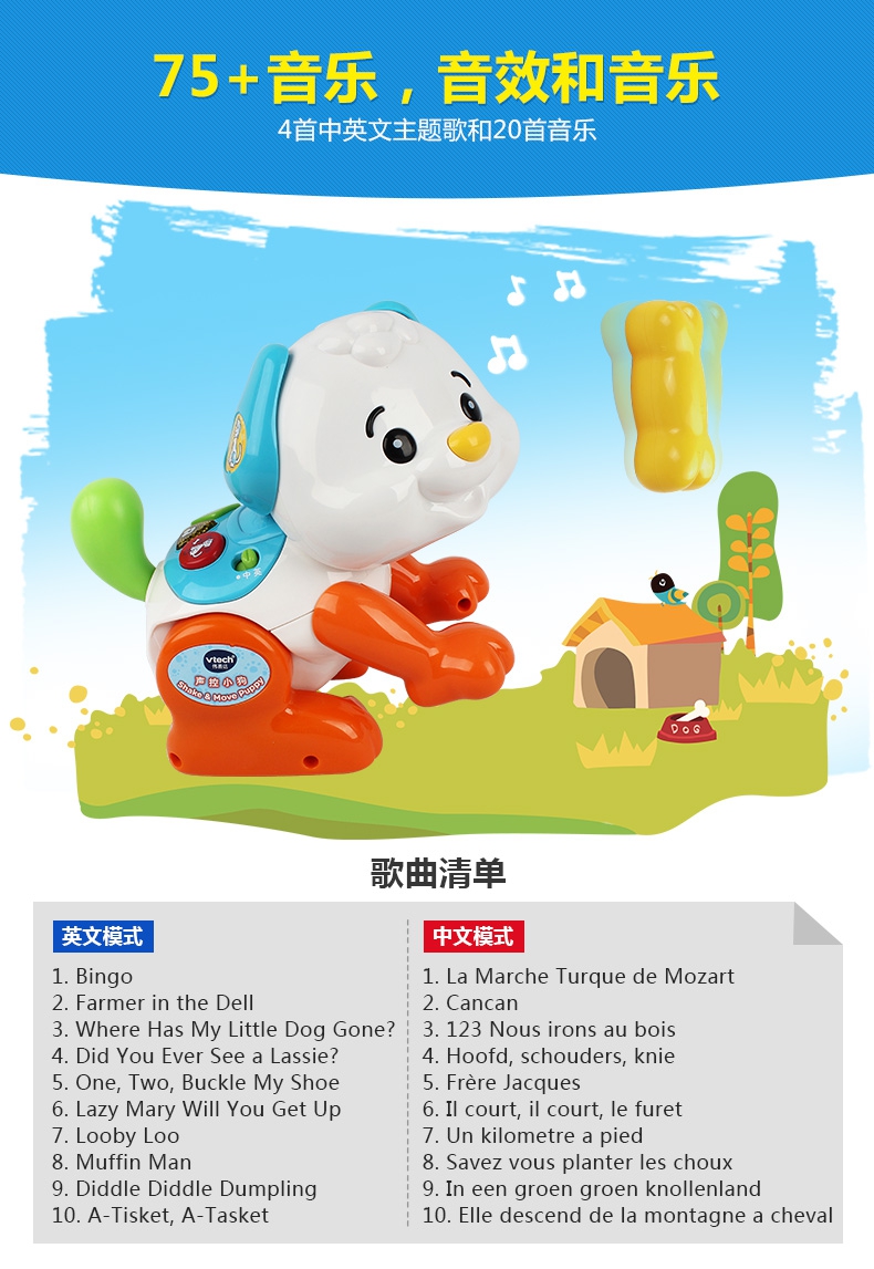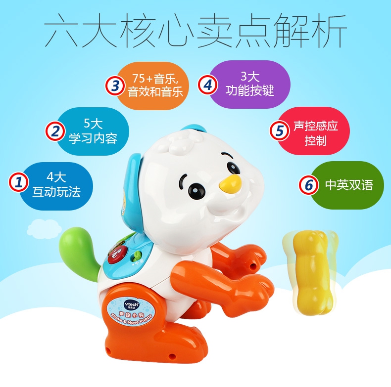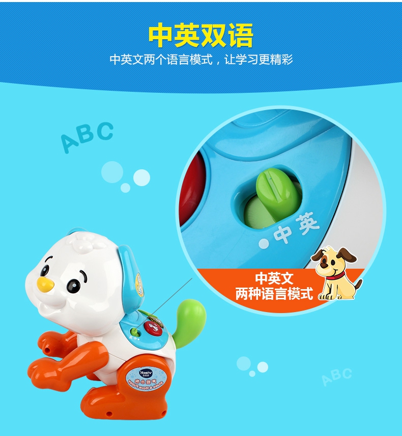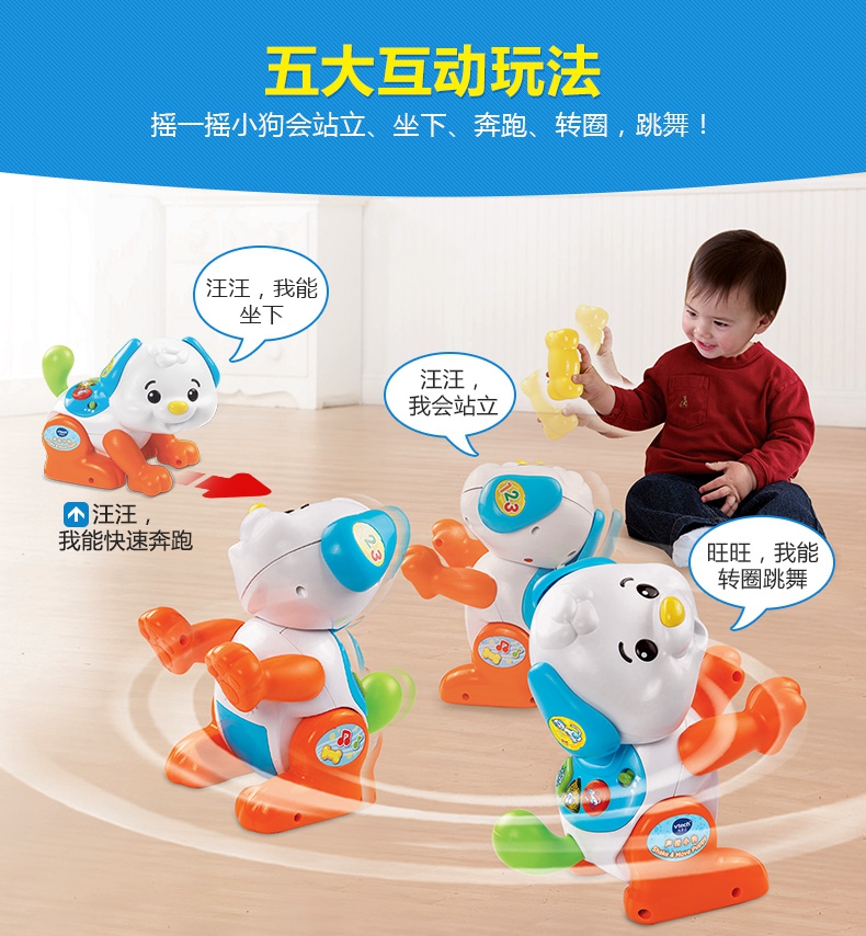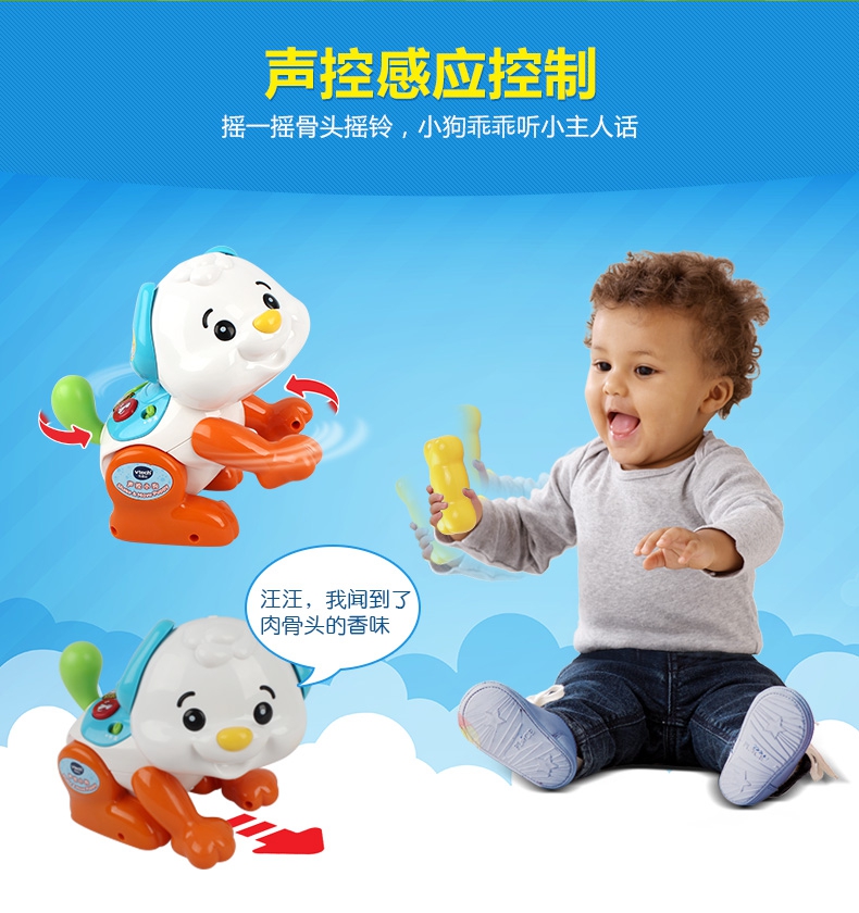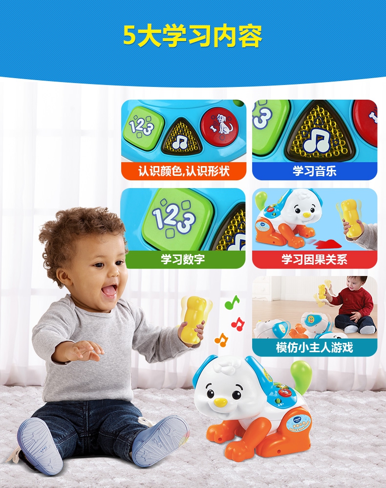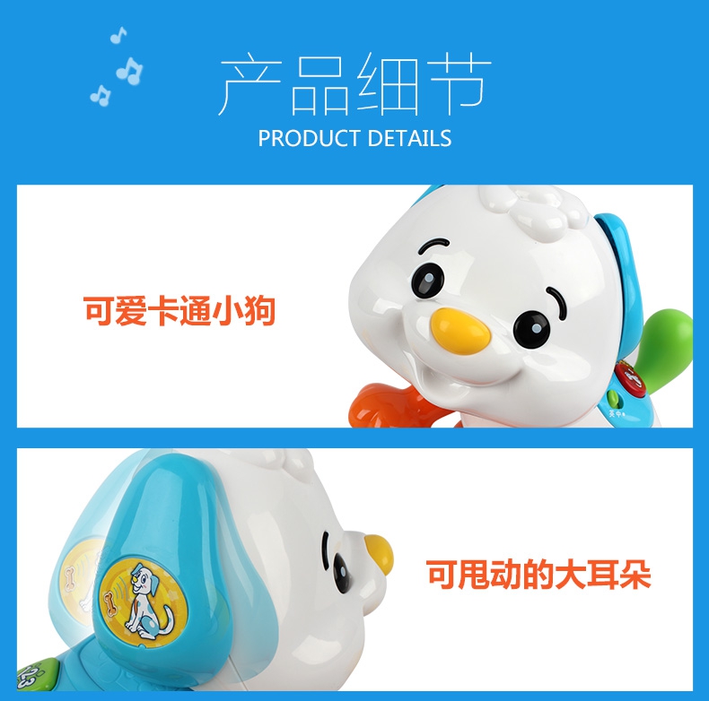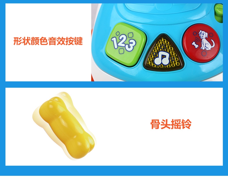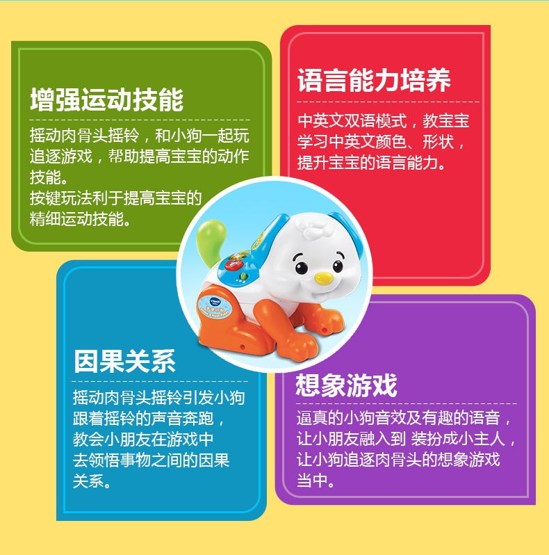 玩具特色:摇动肉骨头摇铃,和小狗一起玩追逐游戏,帮助提高