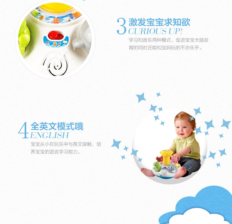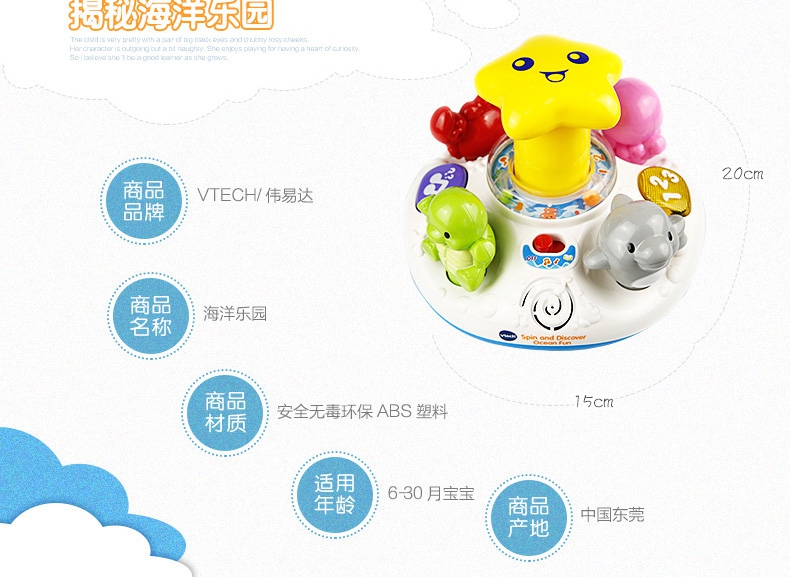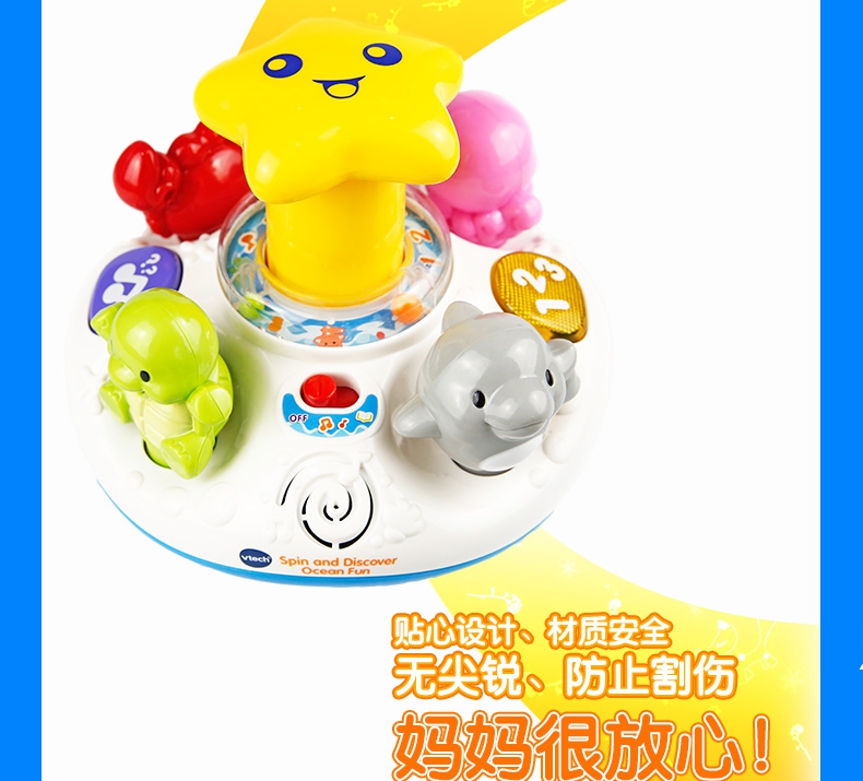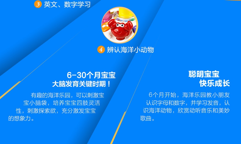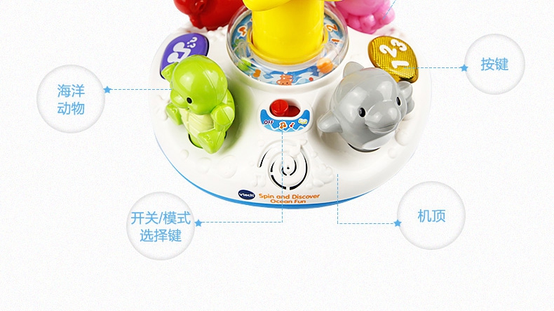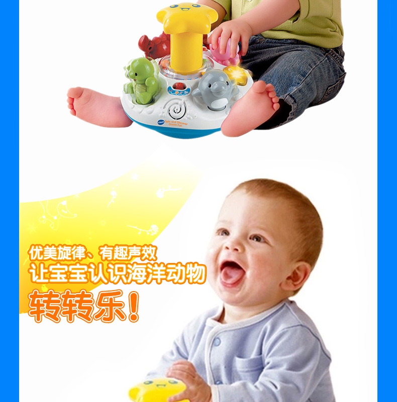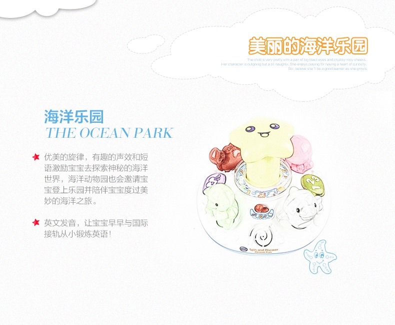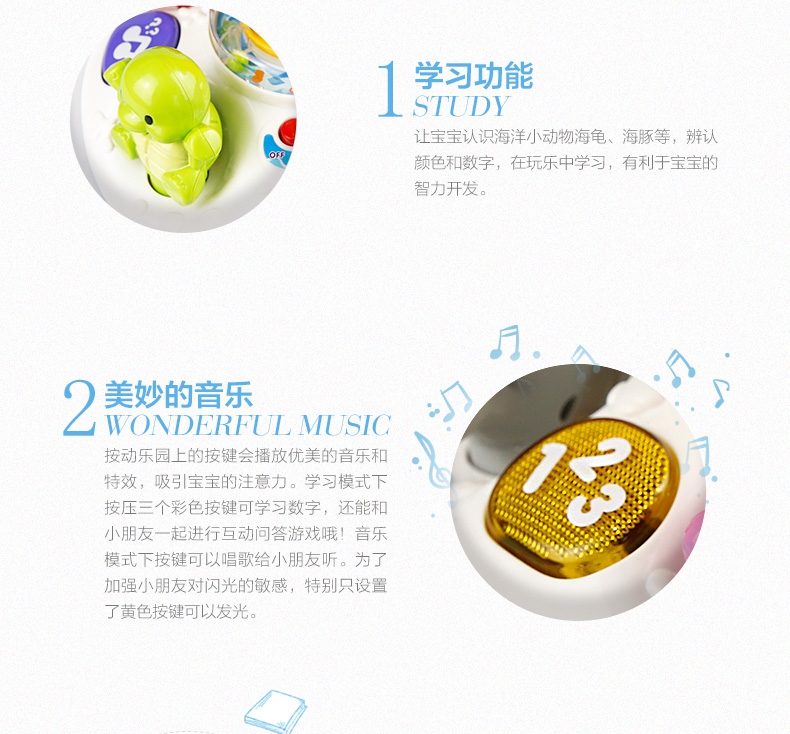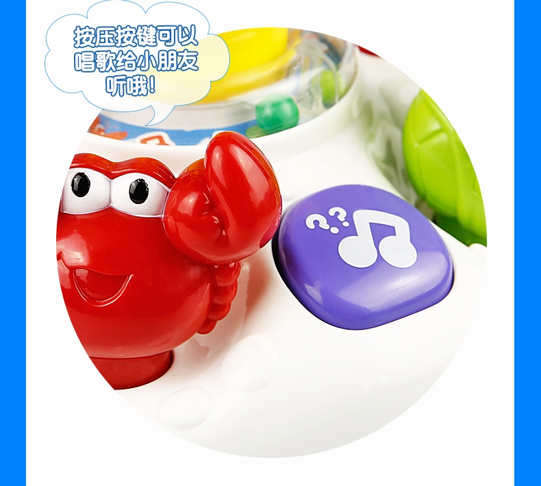 玩具特色:优美旋律、有趣声效,让宝宝认识海洋动物!