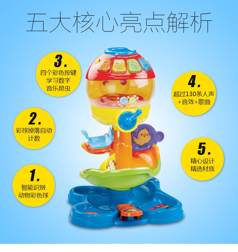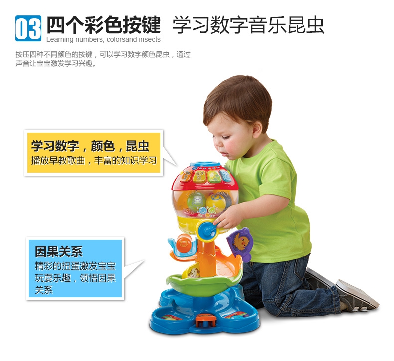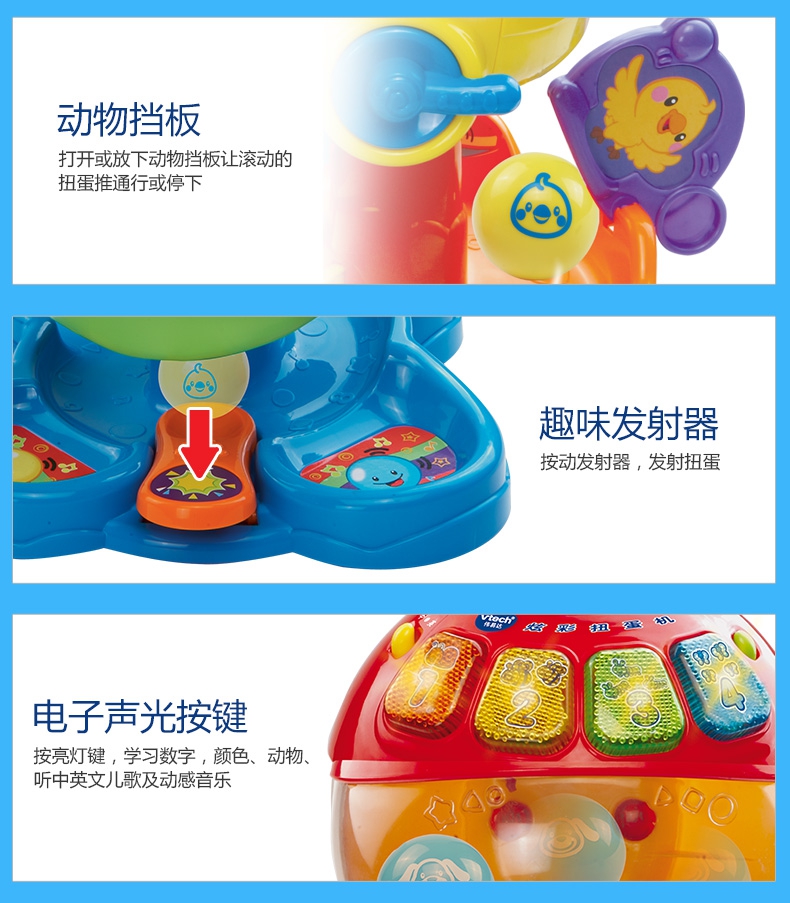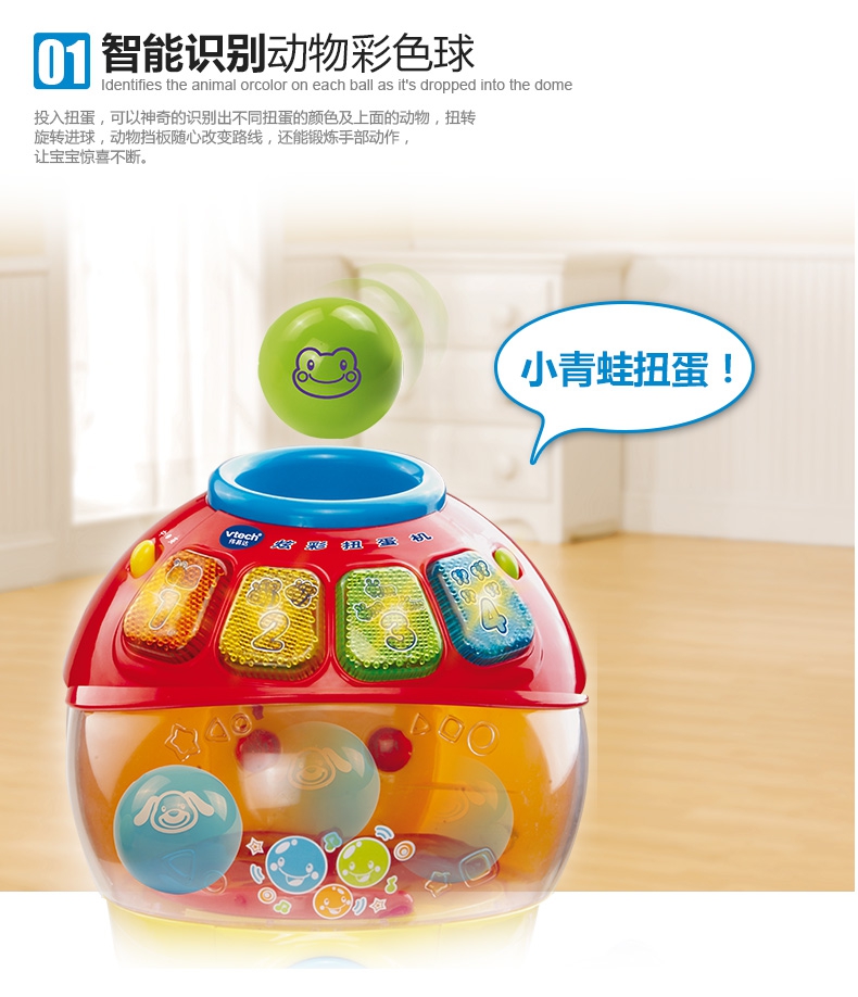 玩具特点:1、智能识别动物彩色球:投入扭蛋能识别出颜色和