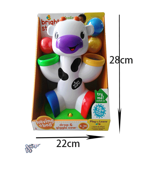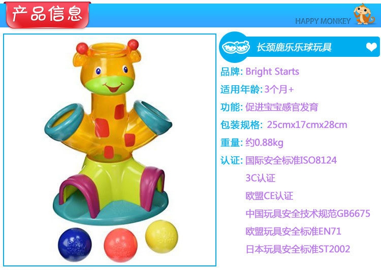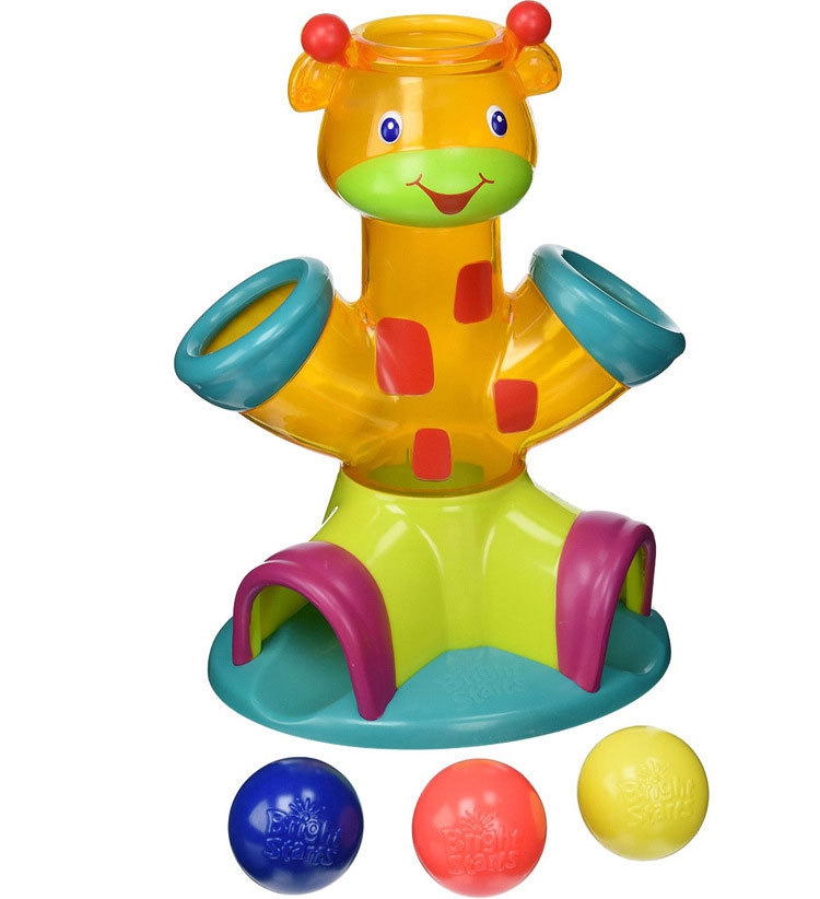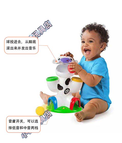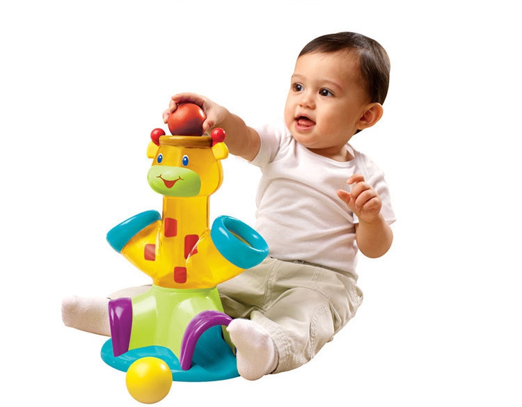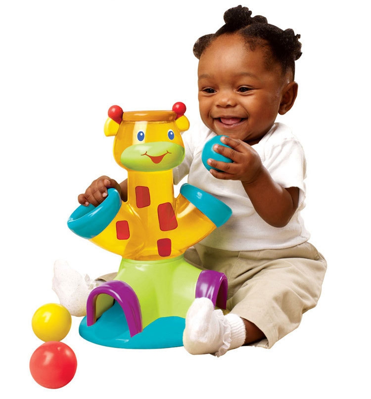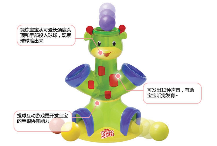 玩具特点:从长颈鹿头顶和手部投入球球,并观察球球滚出来,