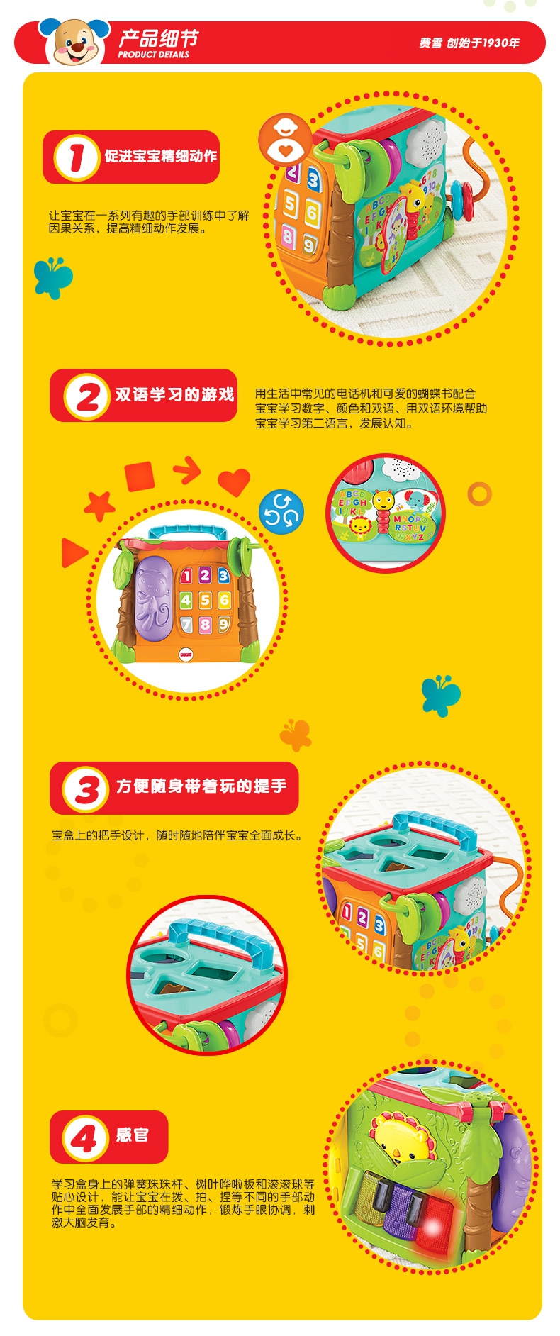 玩具特色:1宝宝反动转动书页时,蝴蝶图书会播放双语字母歌、