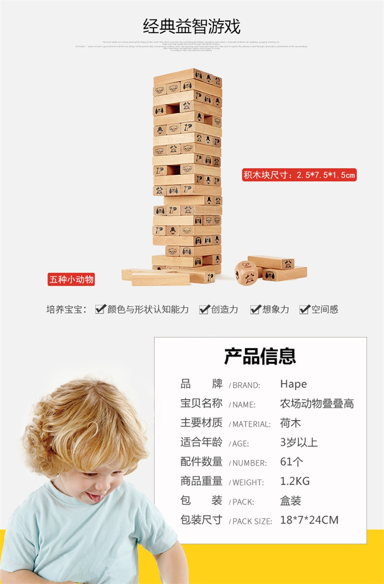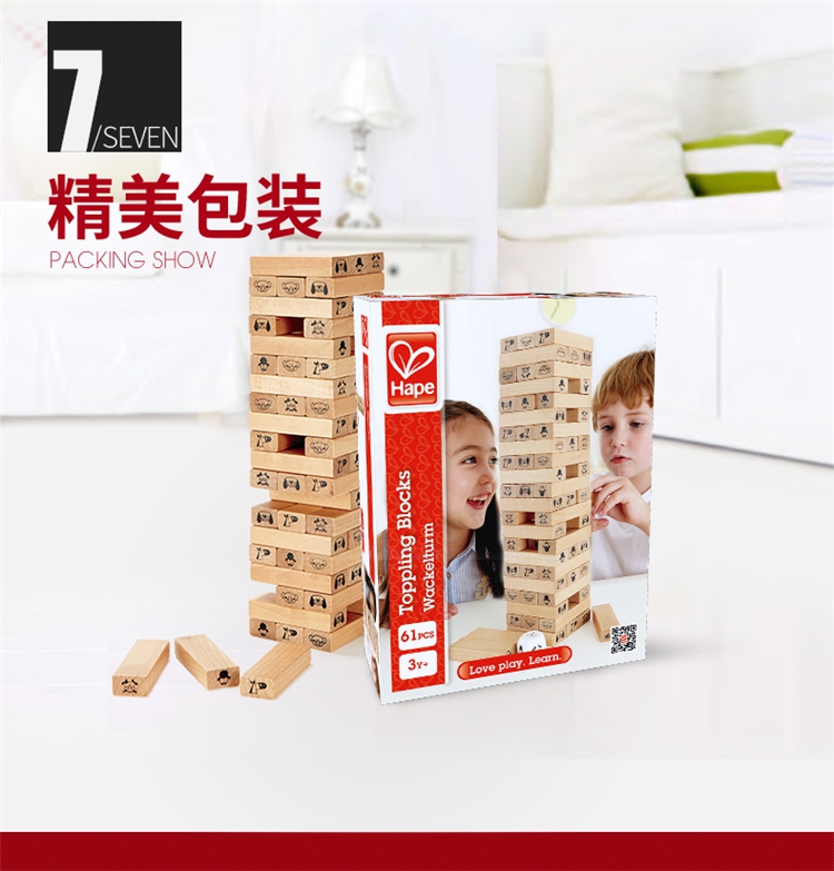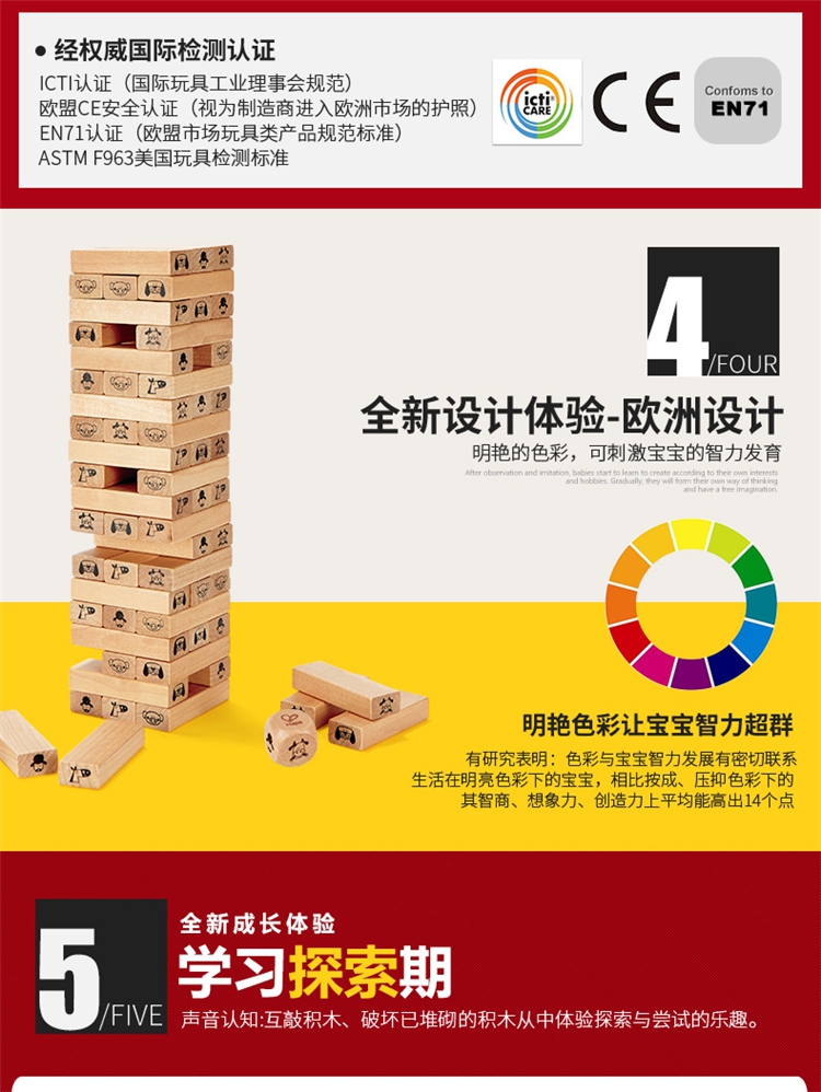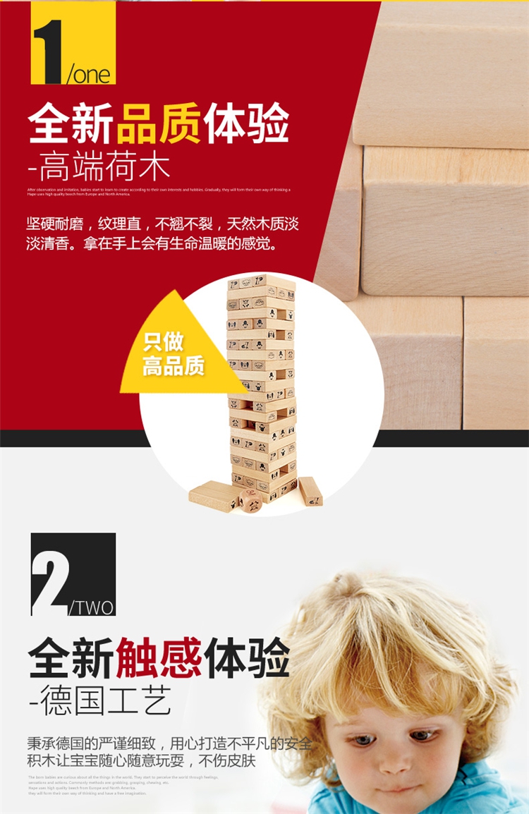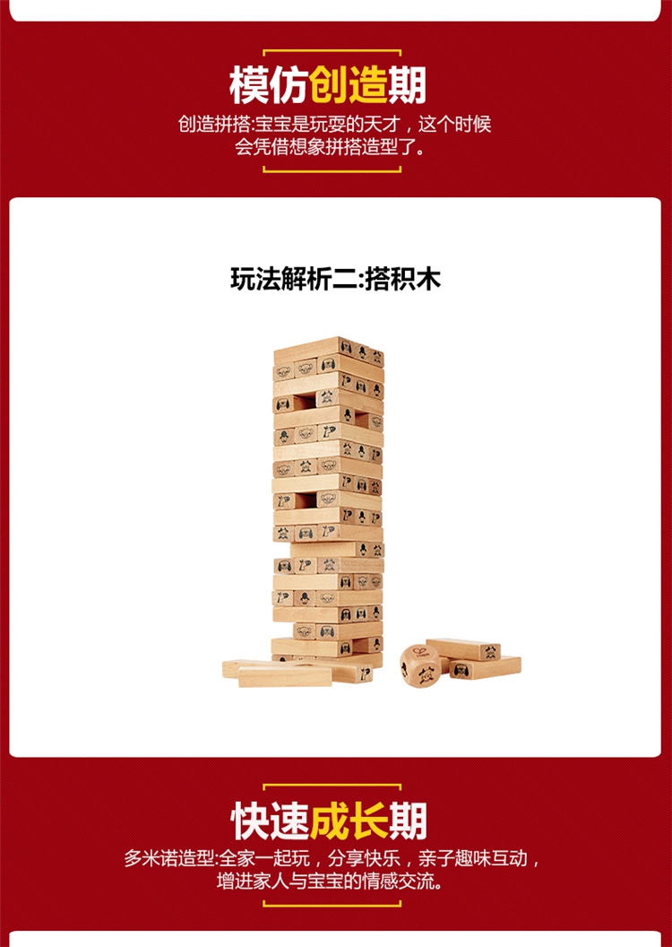 玩具特点:1、叠叠高抽积木:将木块三根为一层,先交错叠搭一