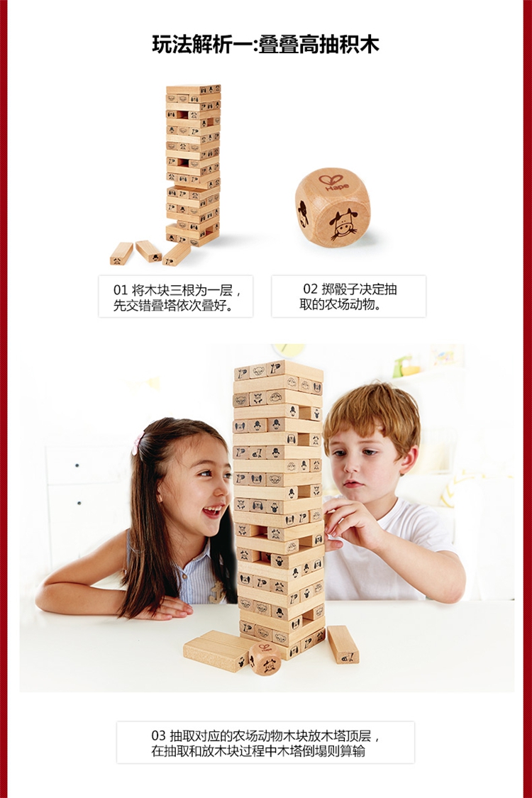 抽取对应的农场动物木块放木塔顶层,在抽取和放