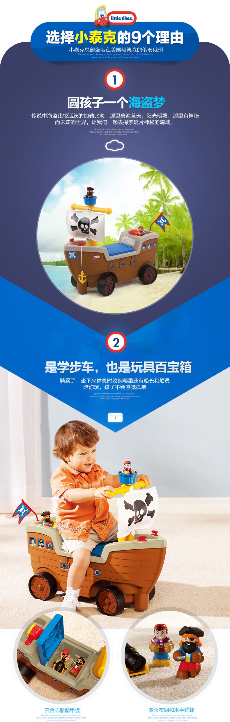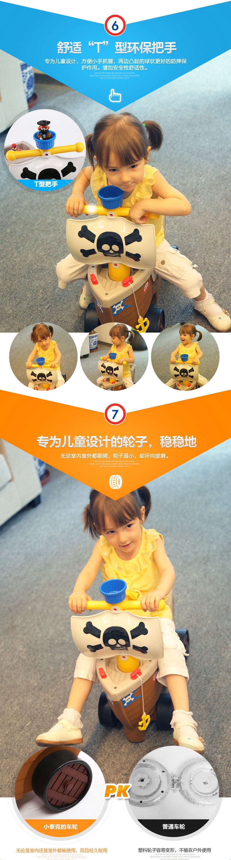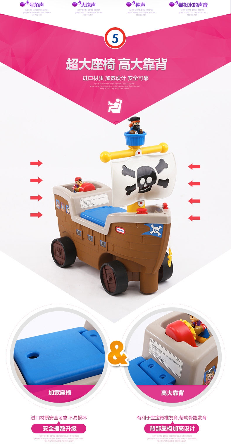 玩具特点:海盗船学步车圆孩子一个海盗梦。这款学