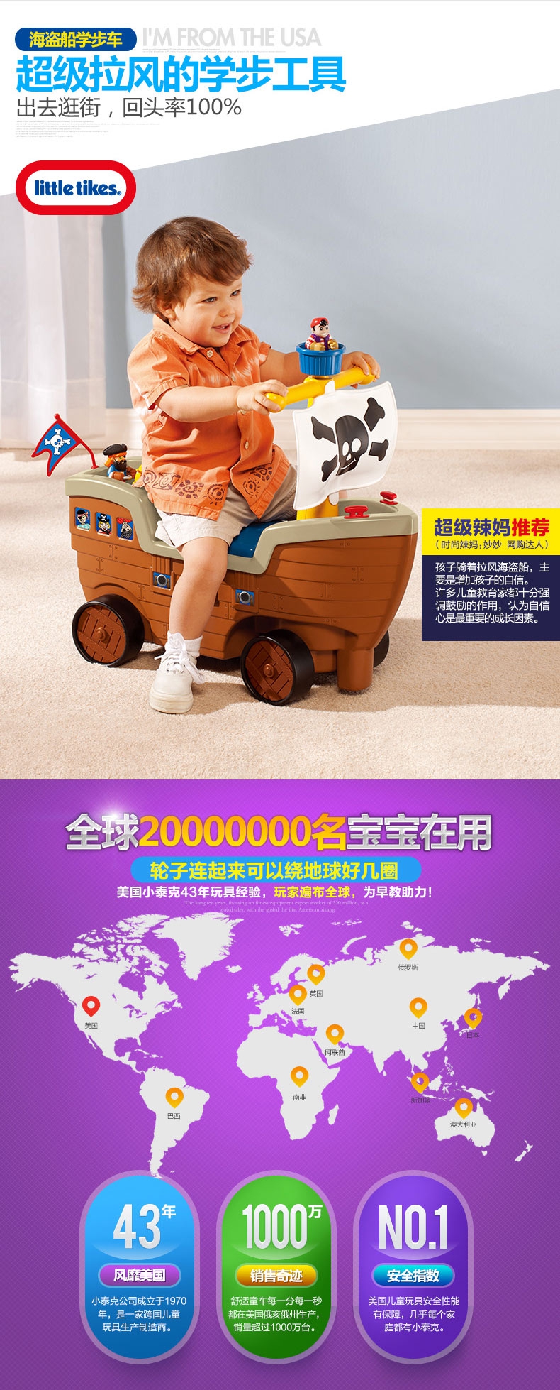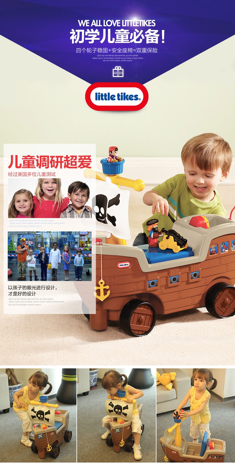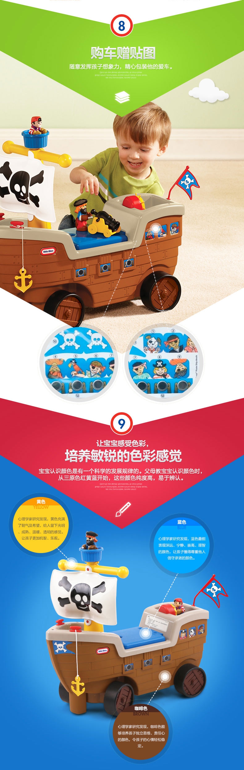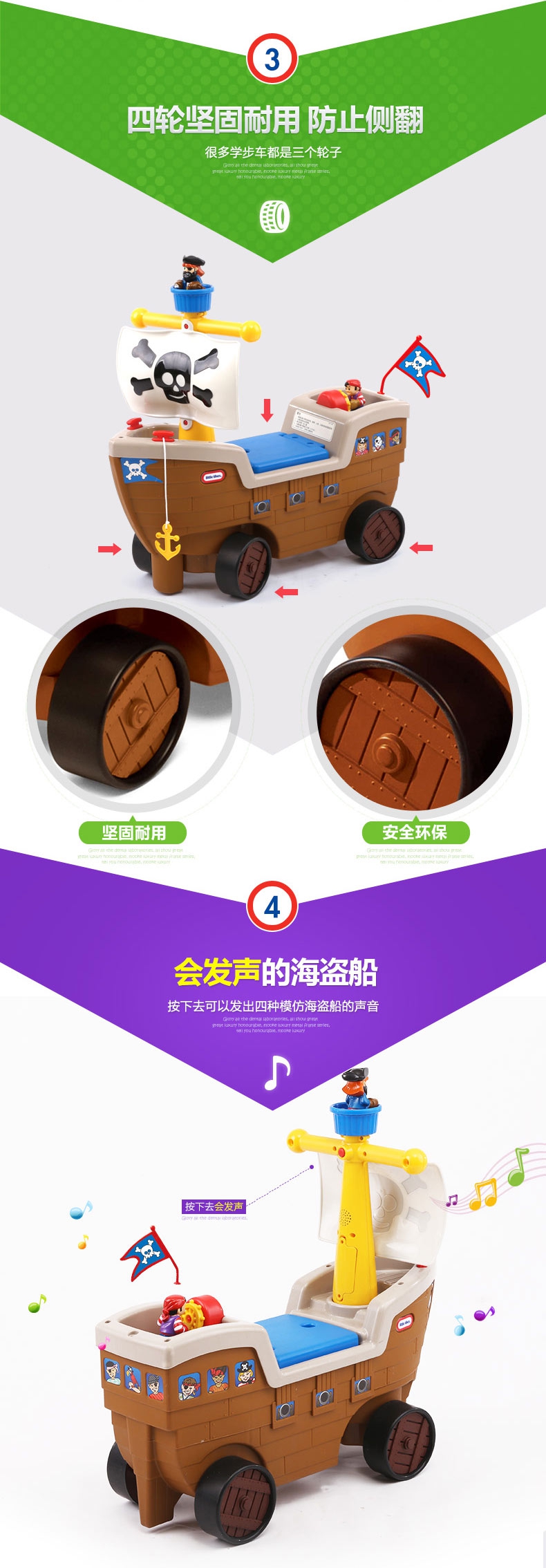 玩具特点:海盗船学步车圆孩子一个海盗梦。这款学