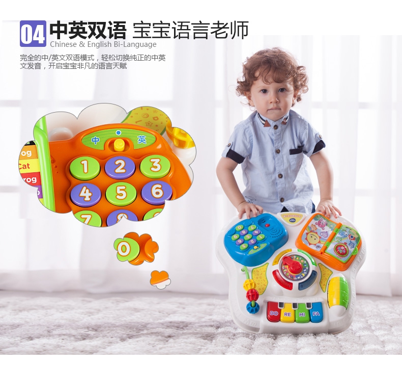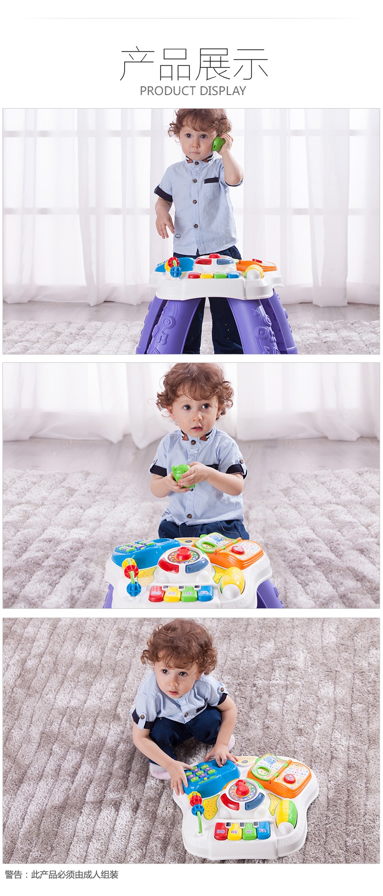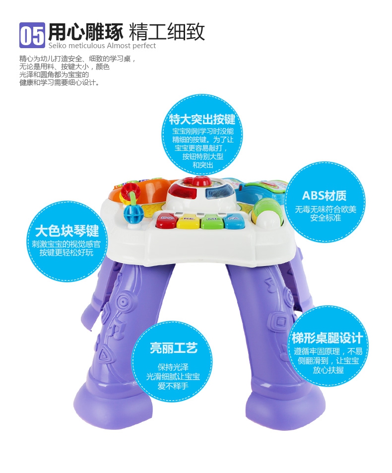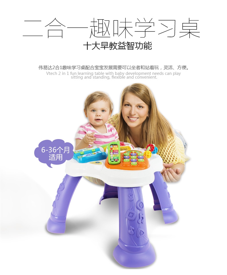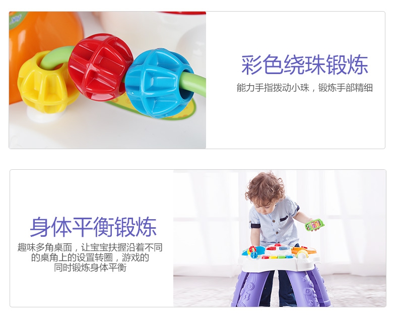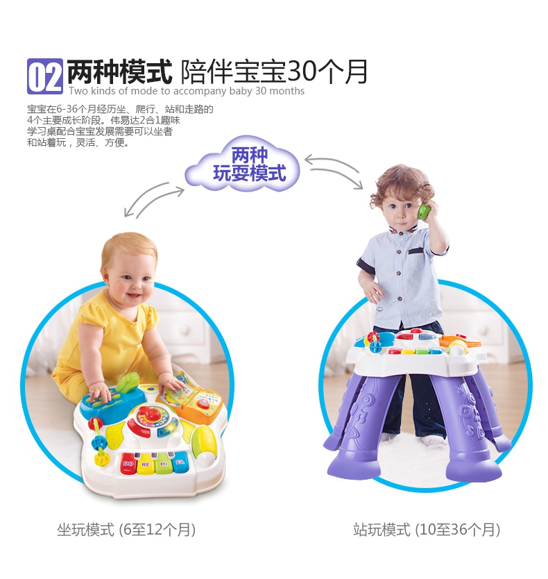 玩具特色:2合一趣味学习桌配合宝宝发展需要可以坐着和站