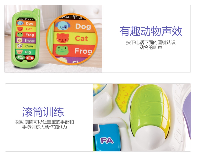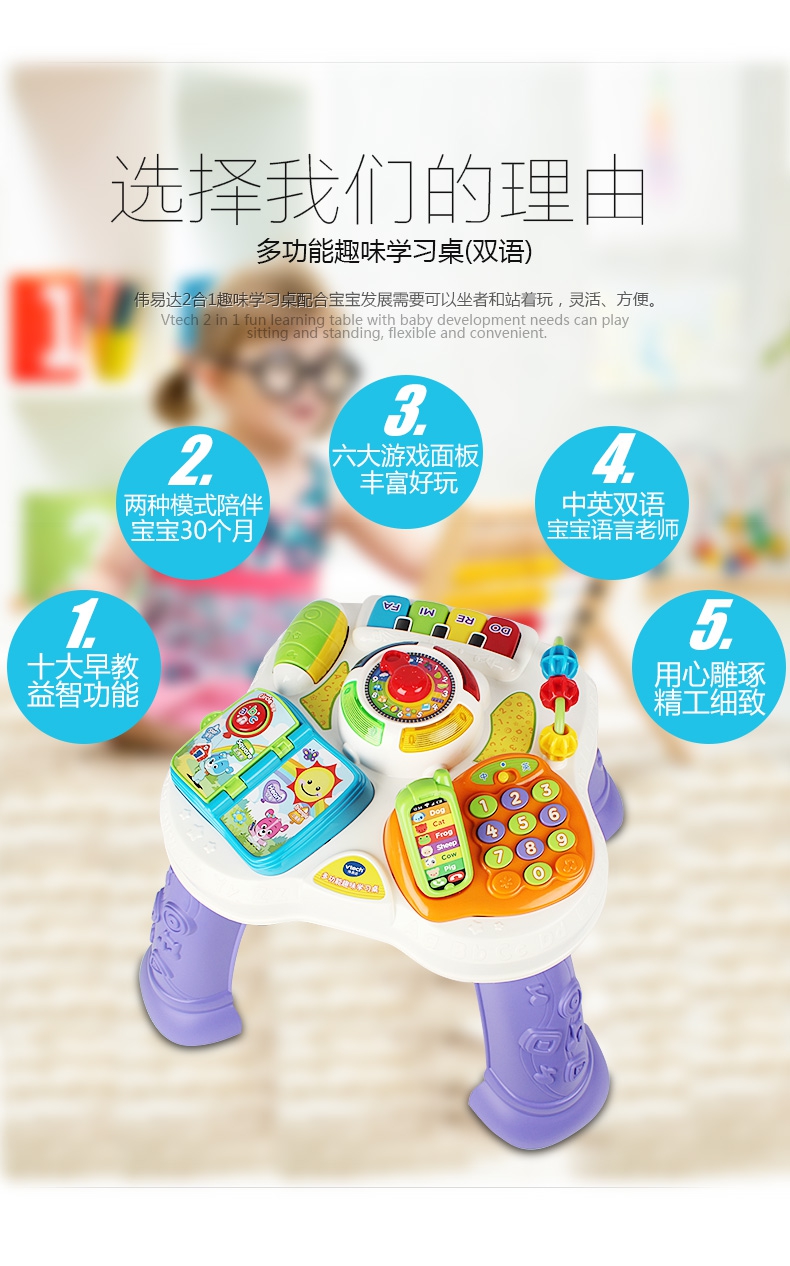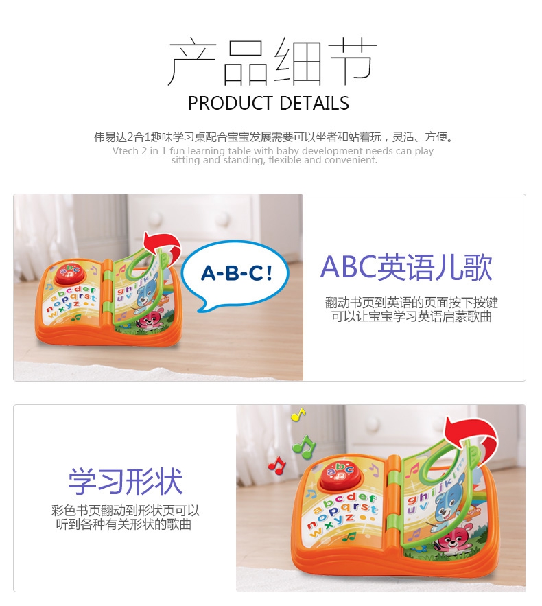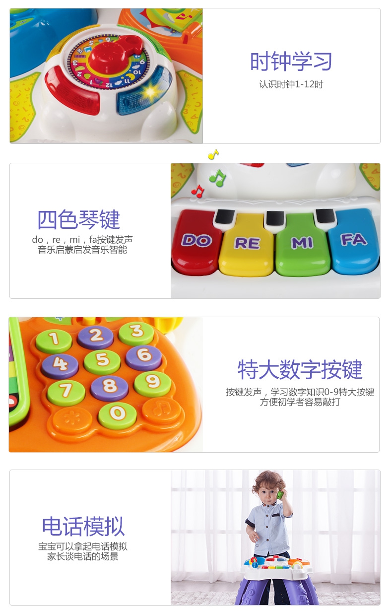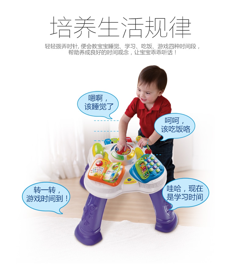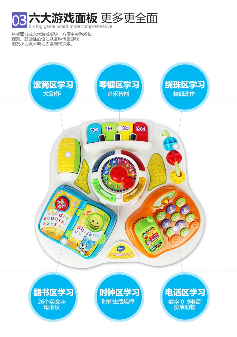 玩具特色:2合一趣味学习桌配合宝宝发展需要可以坐着和站