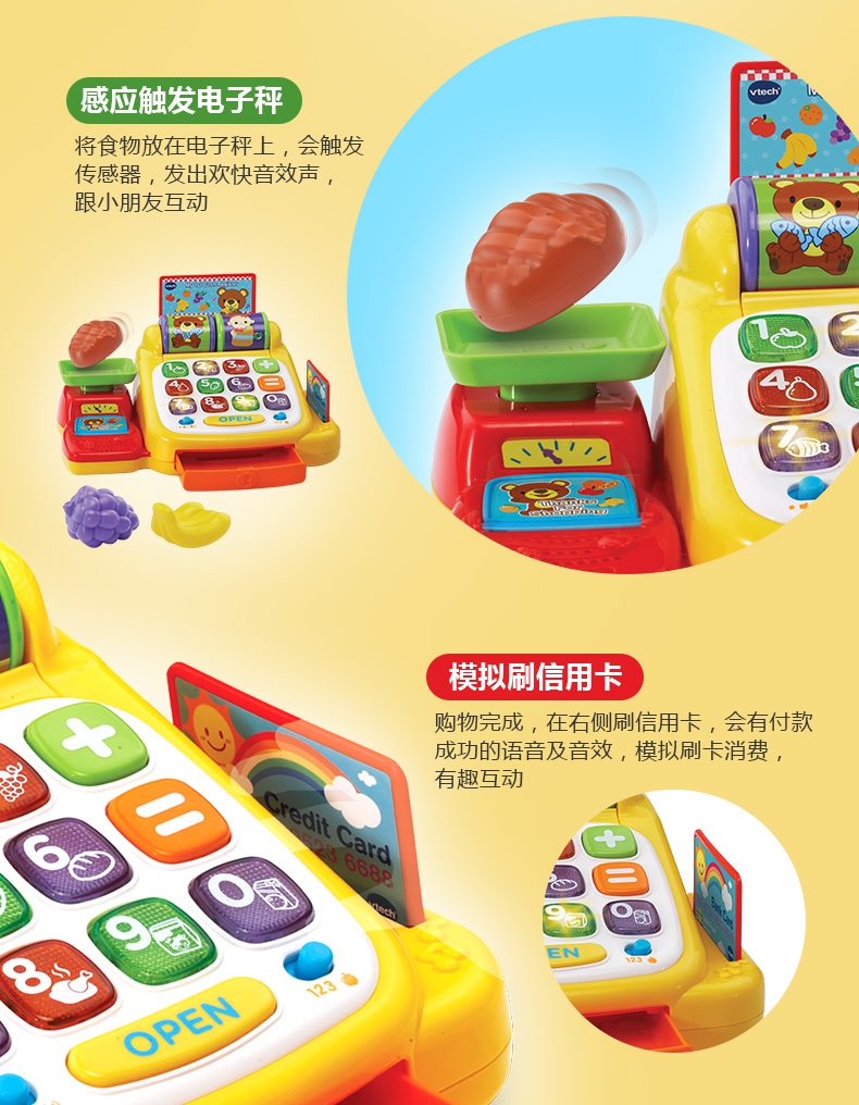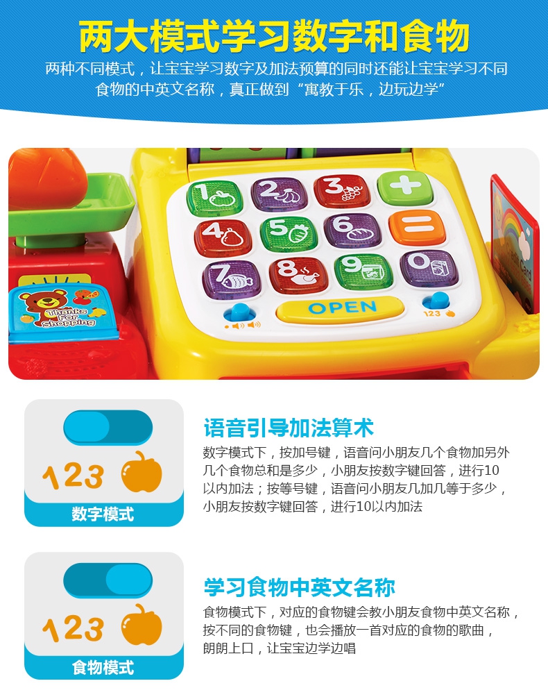 宝宝作为收银员的角色,从食物的称重,计算金额,刷卡