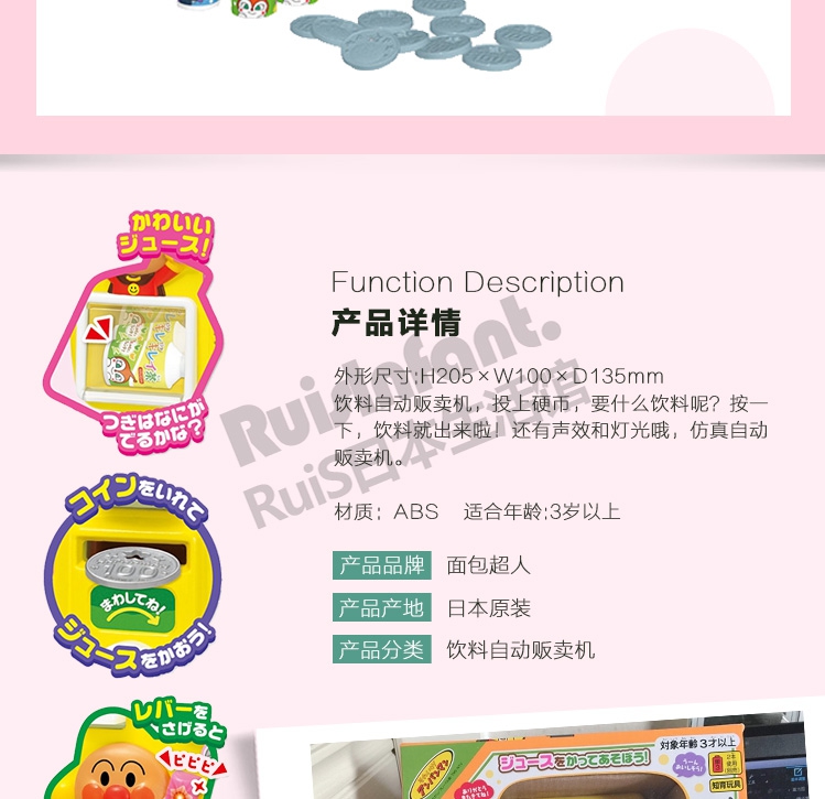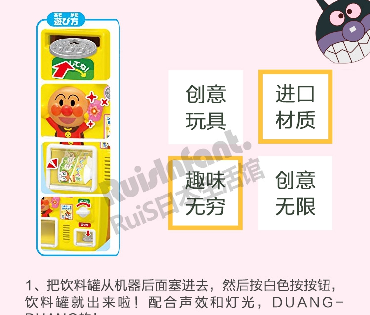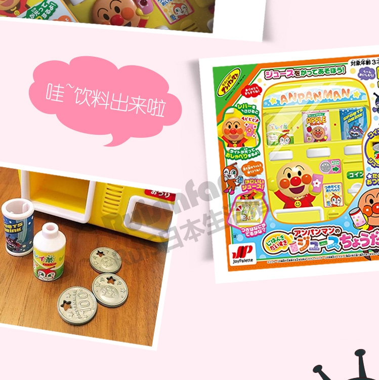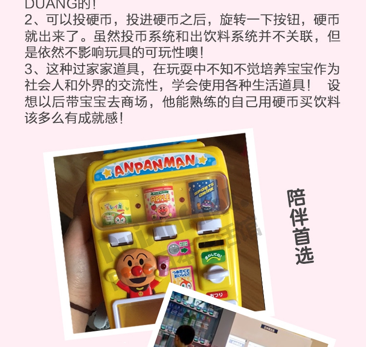 玩具特点:自动贩卖机投入硬币,要什么饮料?按一下就会出来