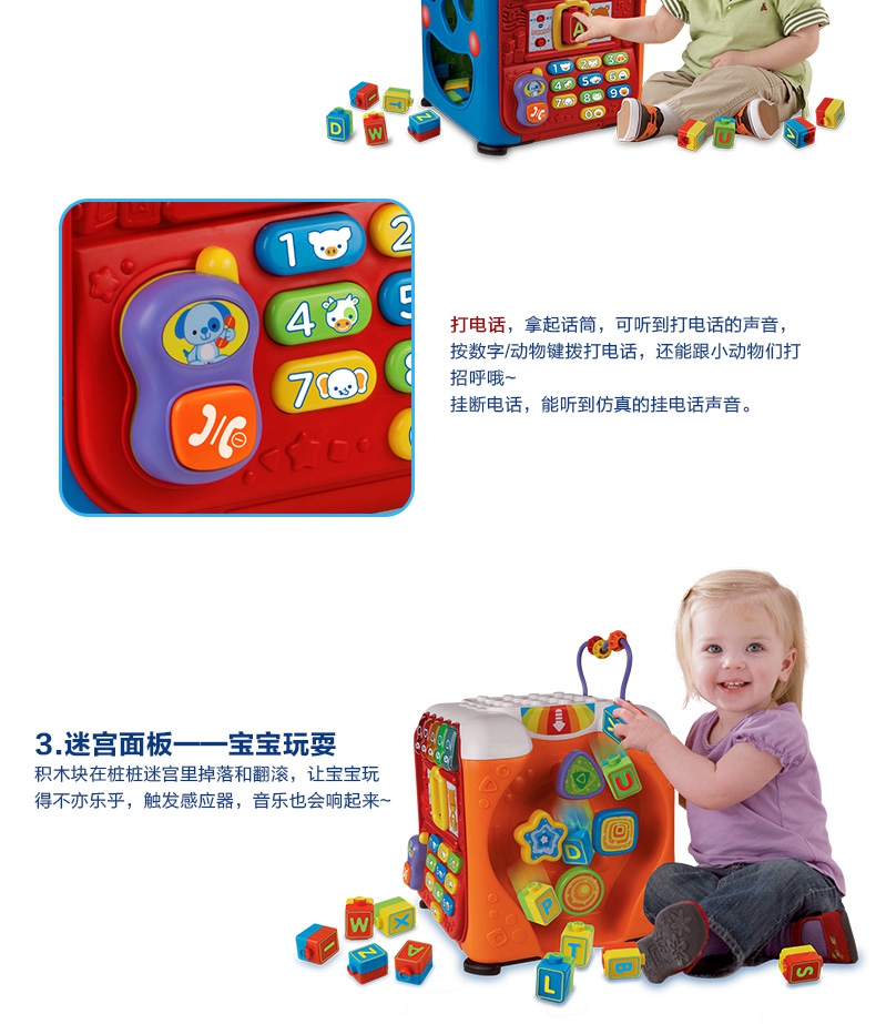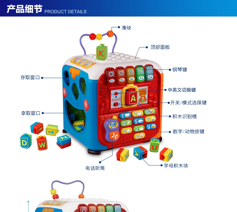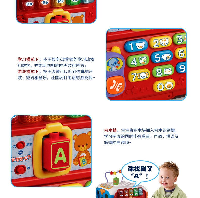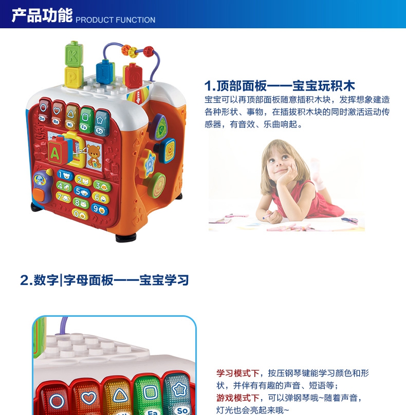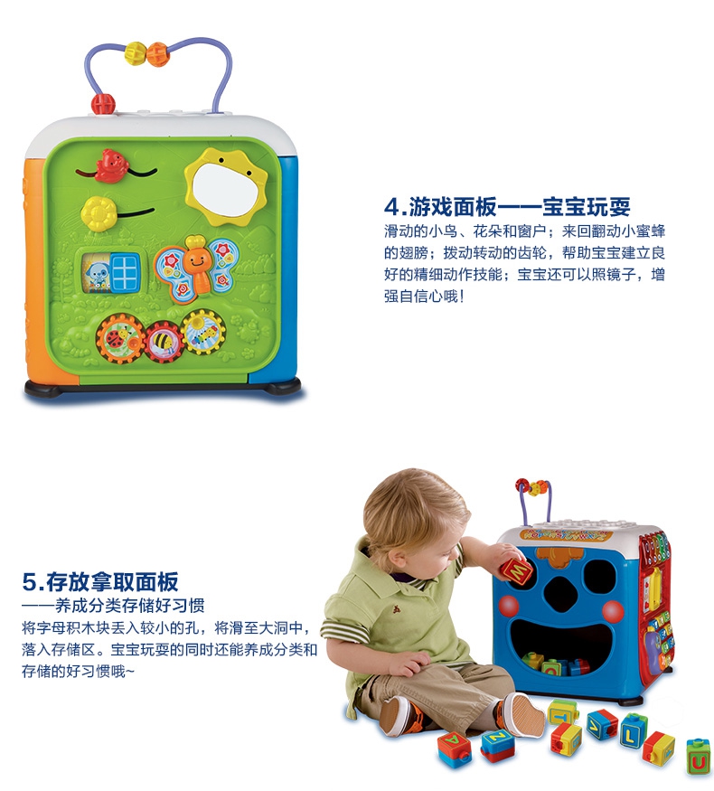 玩具特色:5个学习面板,让宝宝建造、玩耍和学习,趣味多多