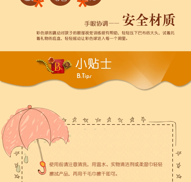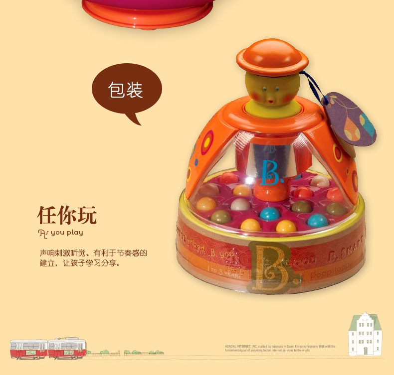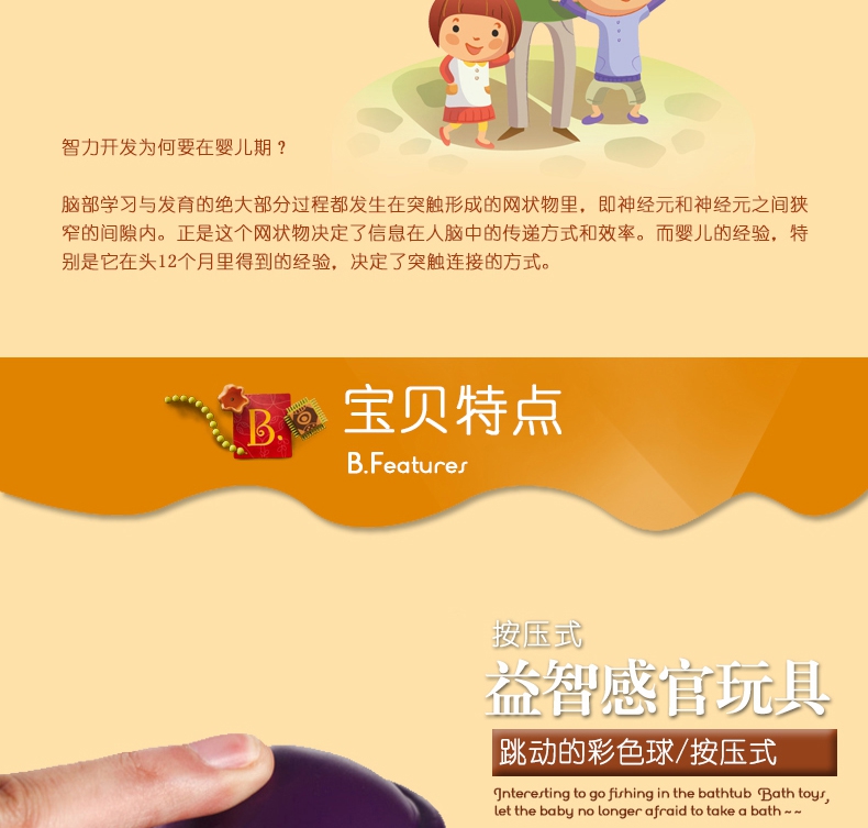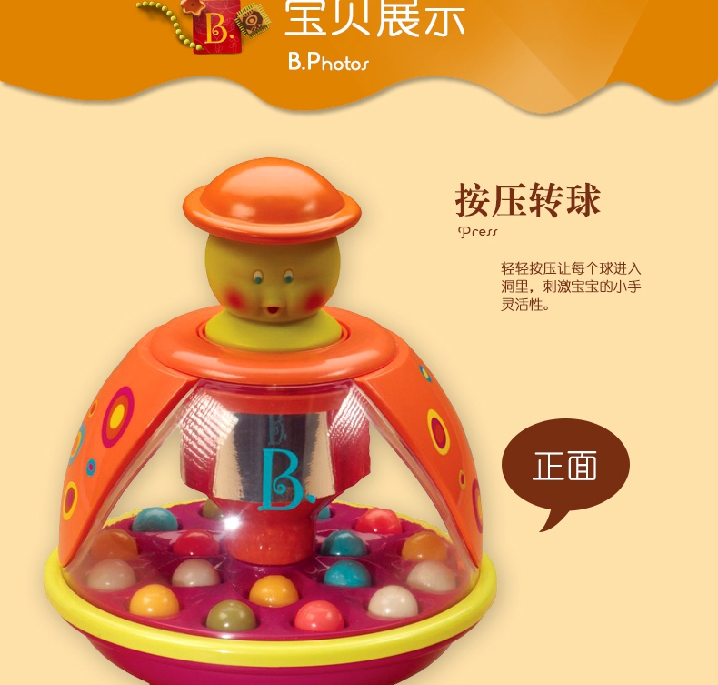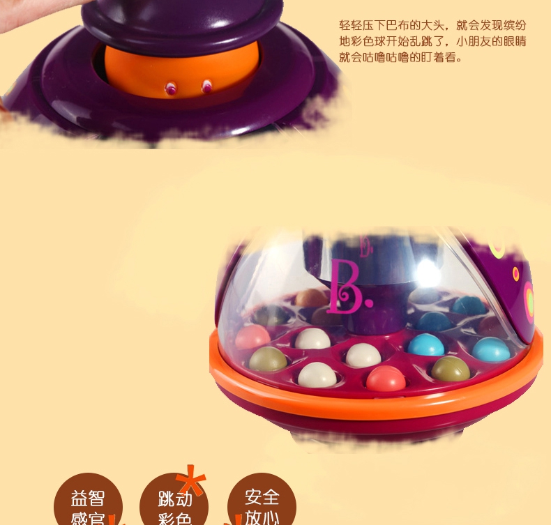 玩具特点:轻轻压下巴布的大头,就会出现缤纷的彩球开始乱跳