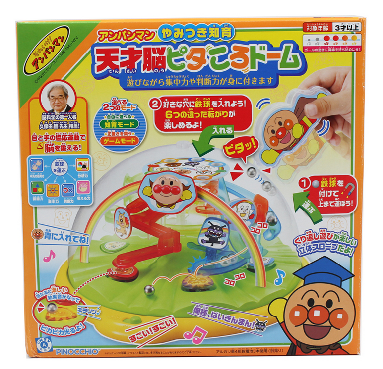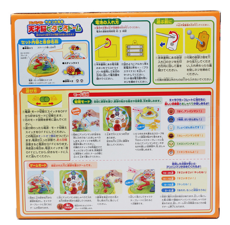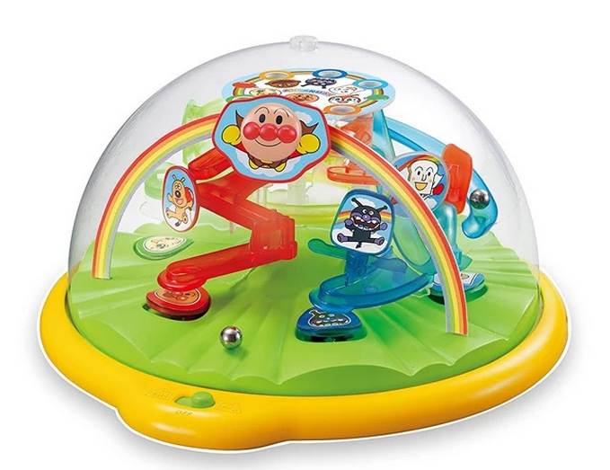 玩具特点:面包超人是带有磁力的,将弹珠运送到顶部轨道上,在