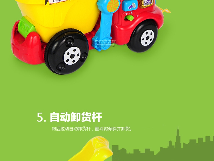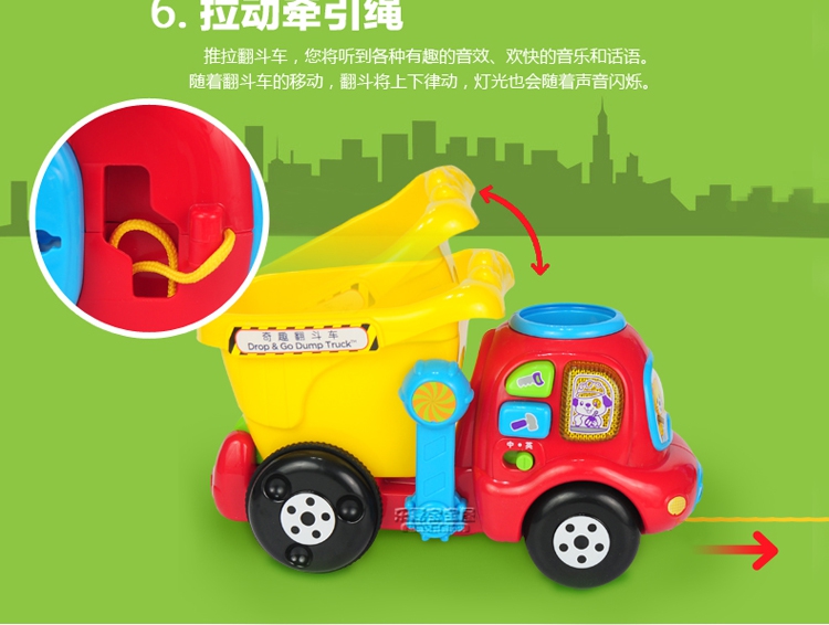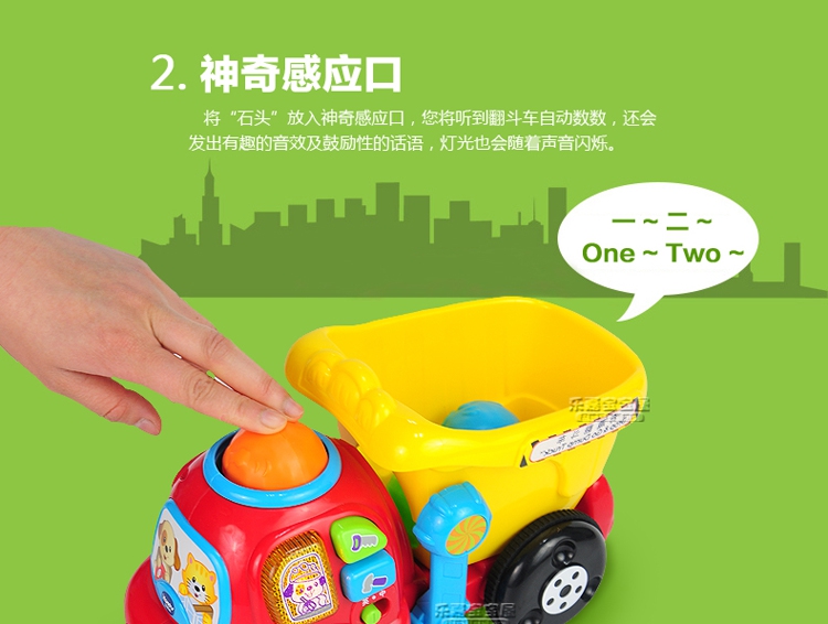玩具特点:轻松装卸的翻斗车、装卸石头感应数数、边拉边抖动的