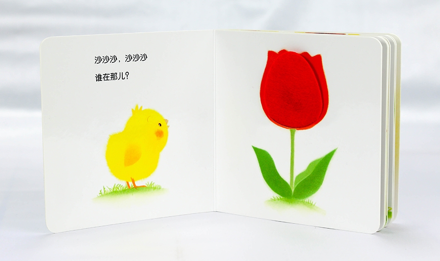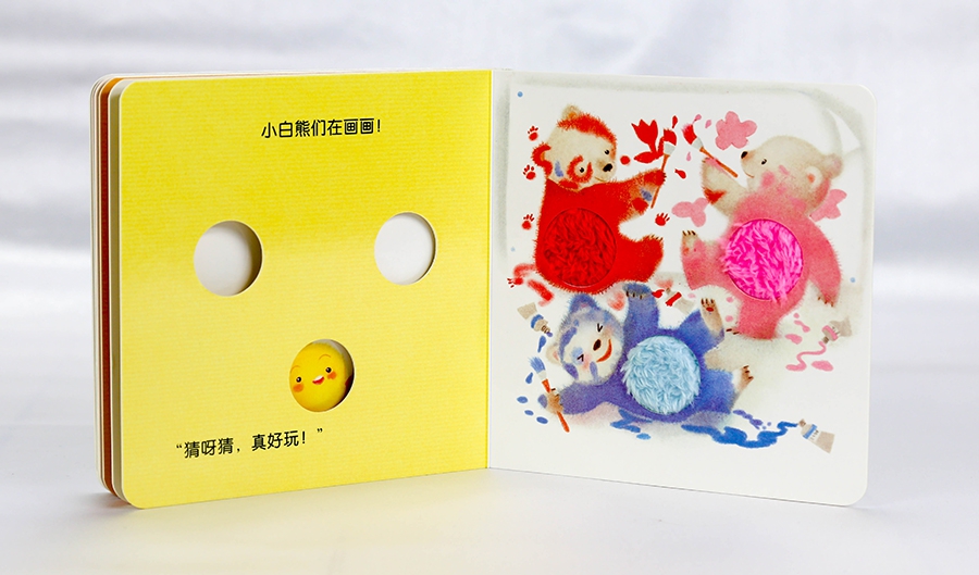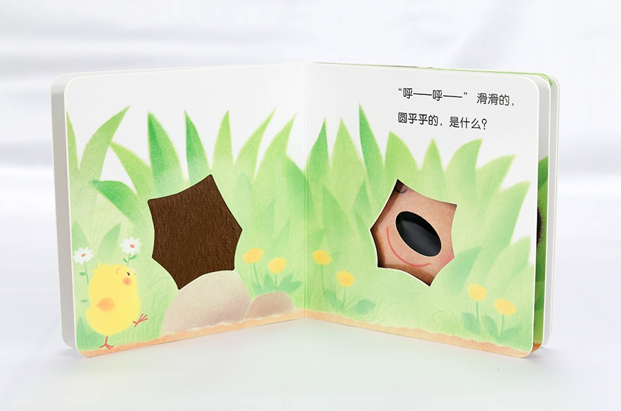 《小鸡球球触感玩具书》共包含五册,集聚触觉训练和玩具的特性,1种发声器 5种互动游戏 14种模切洞洞 28种触摸材料,每册以小鸡球球为主角,引导孩子参与书中的游戏。在《猜猜这是谁?》一册中,先让孩子观察、触摸不同形状洞洞的颜色和图案,猜测是什么动物,然后再翻页验证答案,将触感训练与观察、想象、猜测、验证等思维过程相结合;《翻一翻,哇!》将翻页和触摸相结合,让孩子通过拟声词和呈现的场景,猜测翻页后面是什么小动物,然后再翻开验证;《叽叽叽,你好!》使用了触摸 按压发声器组合,通过小鸡球球一天的活动,教孩子学习礼貌用语,同时用手按压发声器,还能锻炼手部动作;《摸一摸,软绵绵》以藏猫猫的形式,引导孩子去猜猜和认知动物,附加绒布、皮料、颜色坑纸、透明塑料细线等触摸材料能够给孩子丰富的触觉刺激;《谁的屁股毛茸茸?》通过让孩子感知不同细腻程度的绒毛,刺激触觉敏感性的发展。