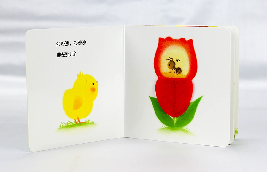 ★《翻一翻,哇!》:“沙沙沙,沙沙沙,谁在那儿?哇!原来是小蚂蚁” 将触摸和翻翻页相结合,让孩子通过拟声词和场景,猜测翻页后面是什么小动物,锻炼想象力和思维力!
