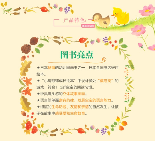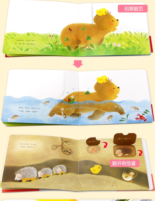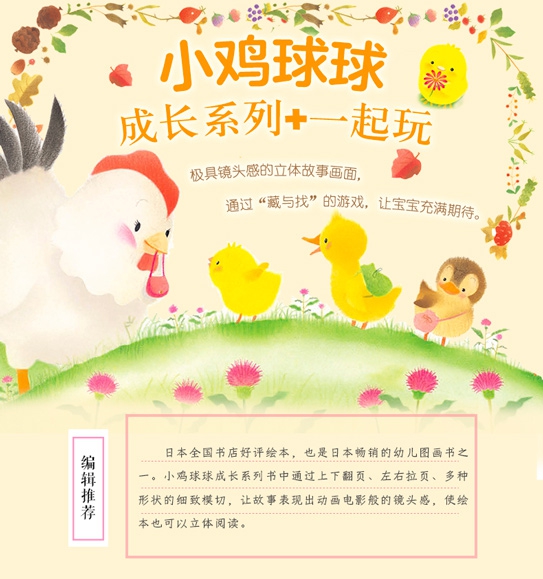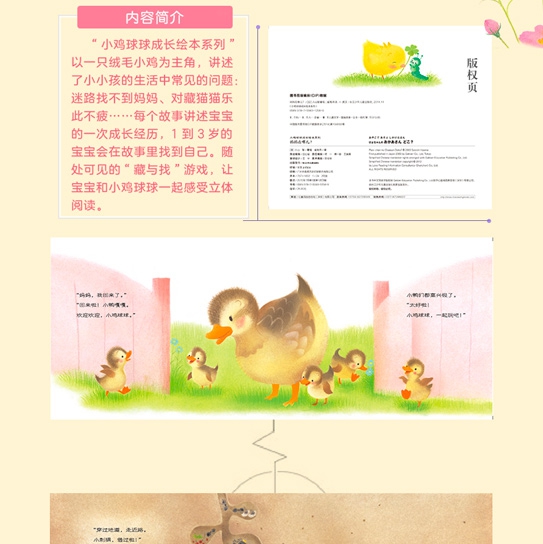 内容推荐“小鸡球球的成长故事”系列共6册,以一只绒毛小鸡为主角,讲述了小小孩的生活中常见的问题:迷路找不到妈妈、遇到小困难、对藏猫猫乐此不疲……每个故事都讲述了宝宝的一次成长经历。13岁的宝宝会在故事里找到自己,更容易产生认同感。随处可见的“藏与找”的游戏,让宝宝充满期待,伸出手去上下翻动、左右查看,调动感官去探索,和小鸡球球一起感受立体阅读。