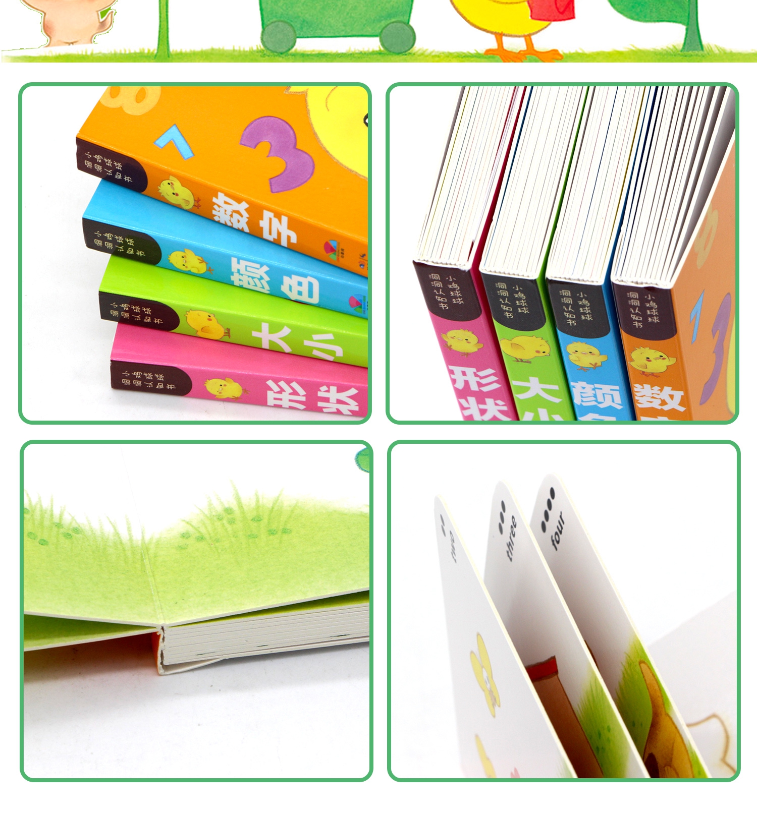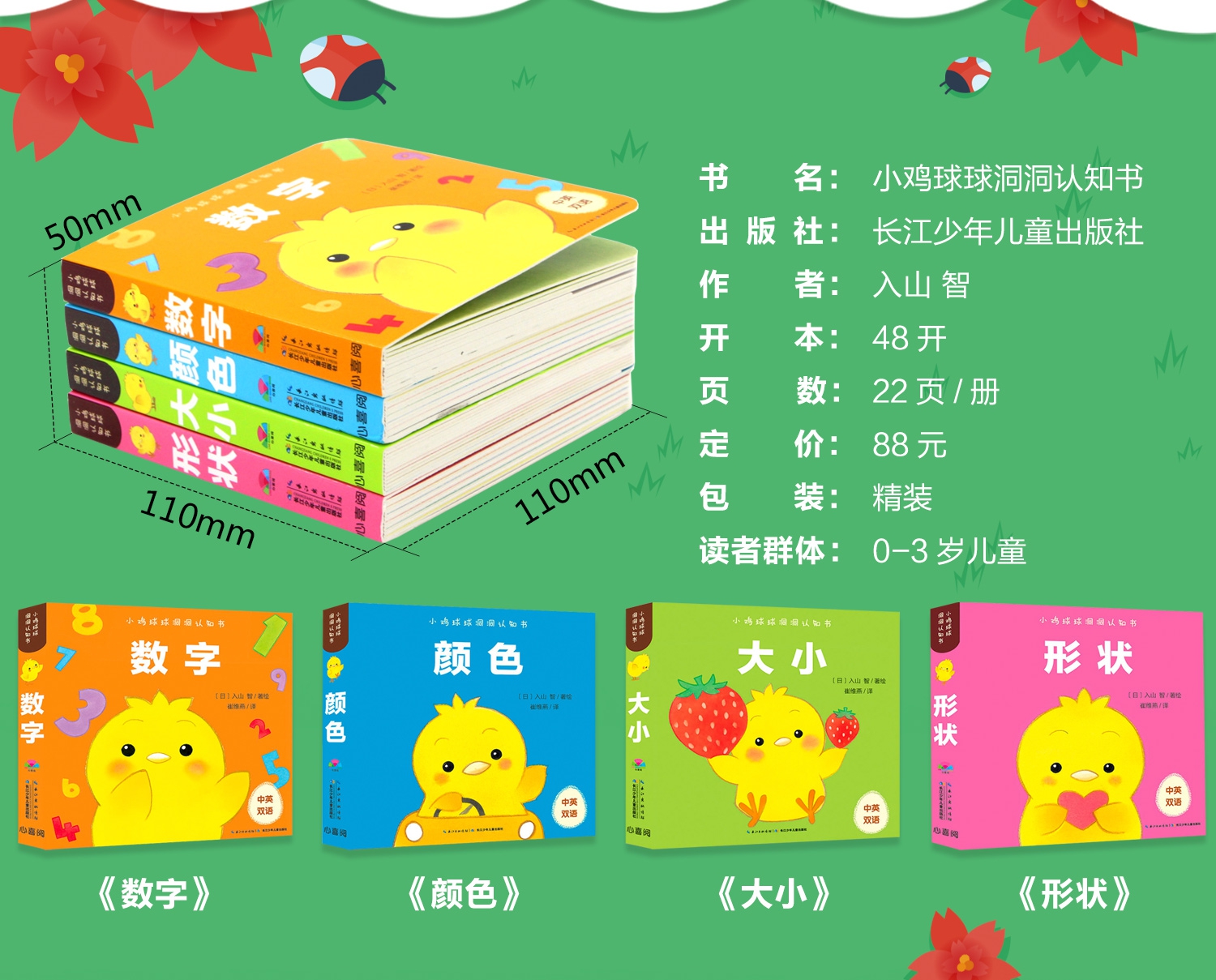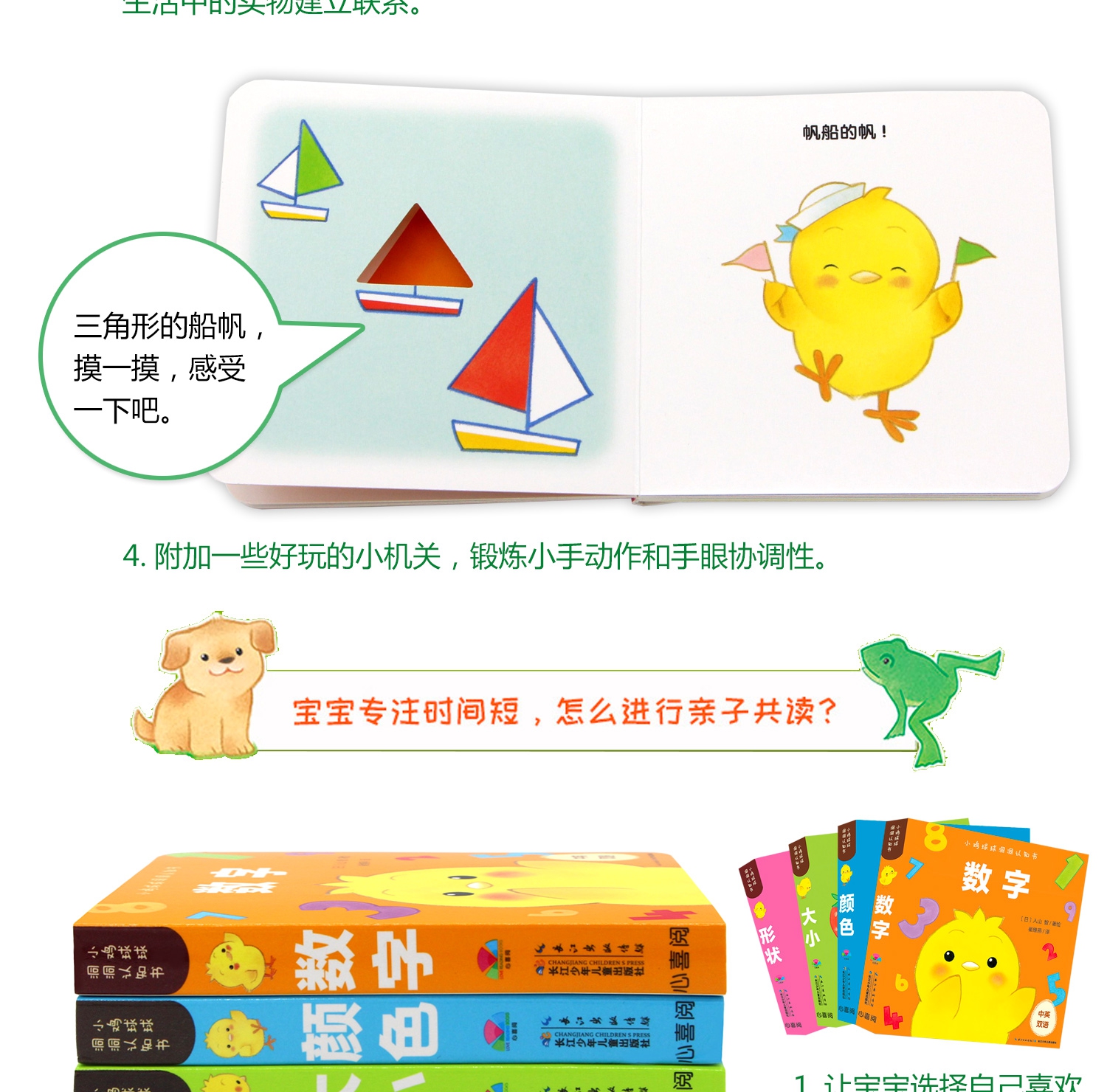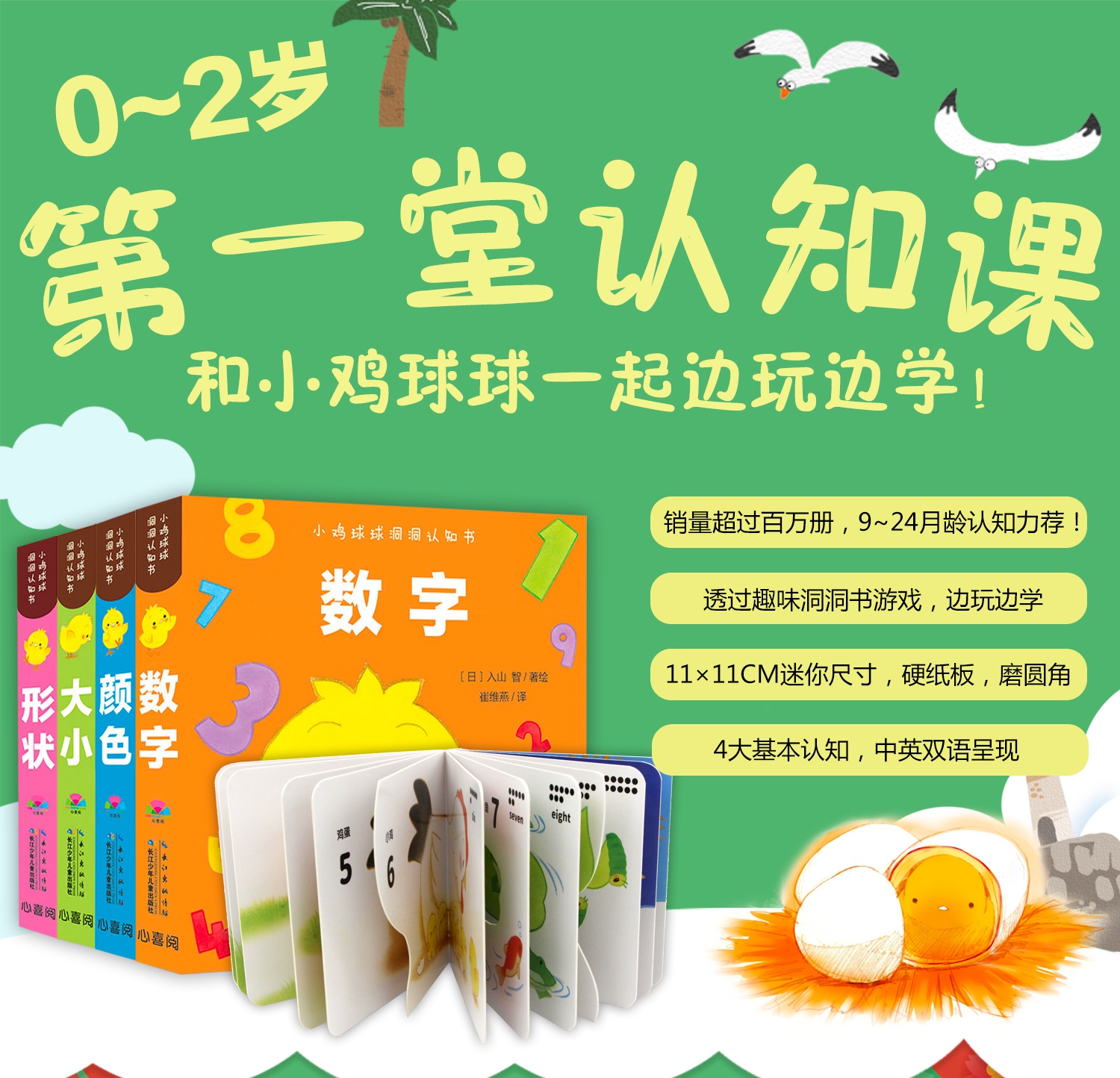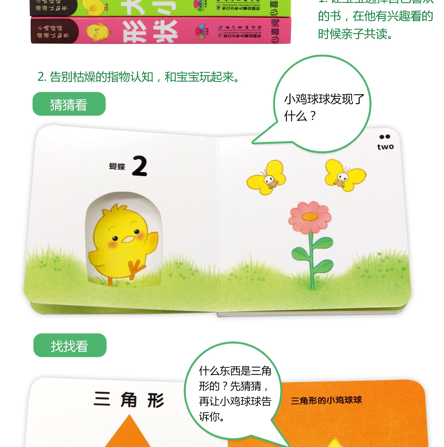 畅销百万册小鸡球球系列又添新作,《小鸡球球洞洞认知书》专为9-24月龄宝宝设计,有趣的洞洞游戏 4大基础认知(数字、颜色、形状、大小),让宝宝在亲子共读共玩的过程中,不仅仅认识基础事物,更能锻炼观察力、想象力和思维力,同时满足小手爱抠洞洞的需求,发展手部动作。