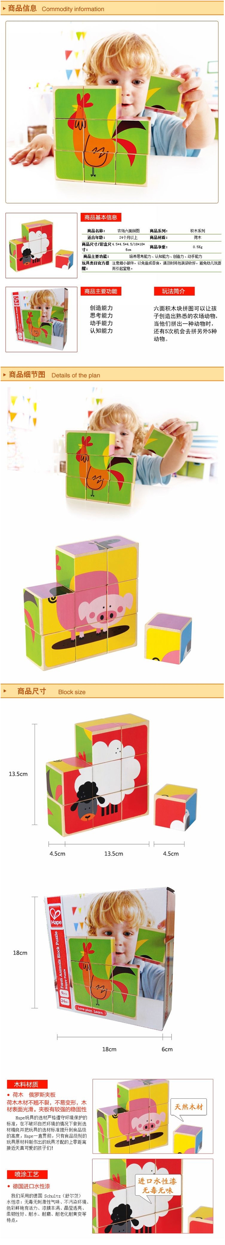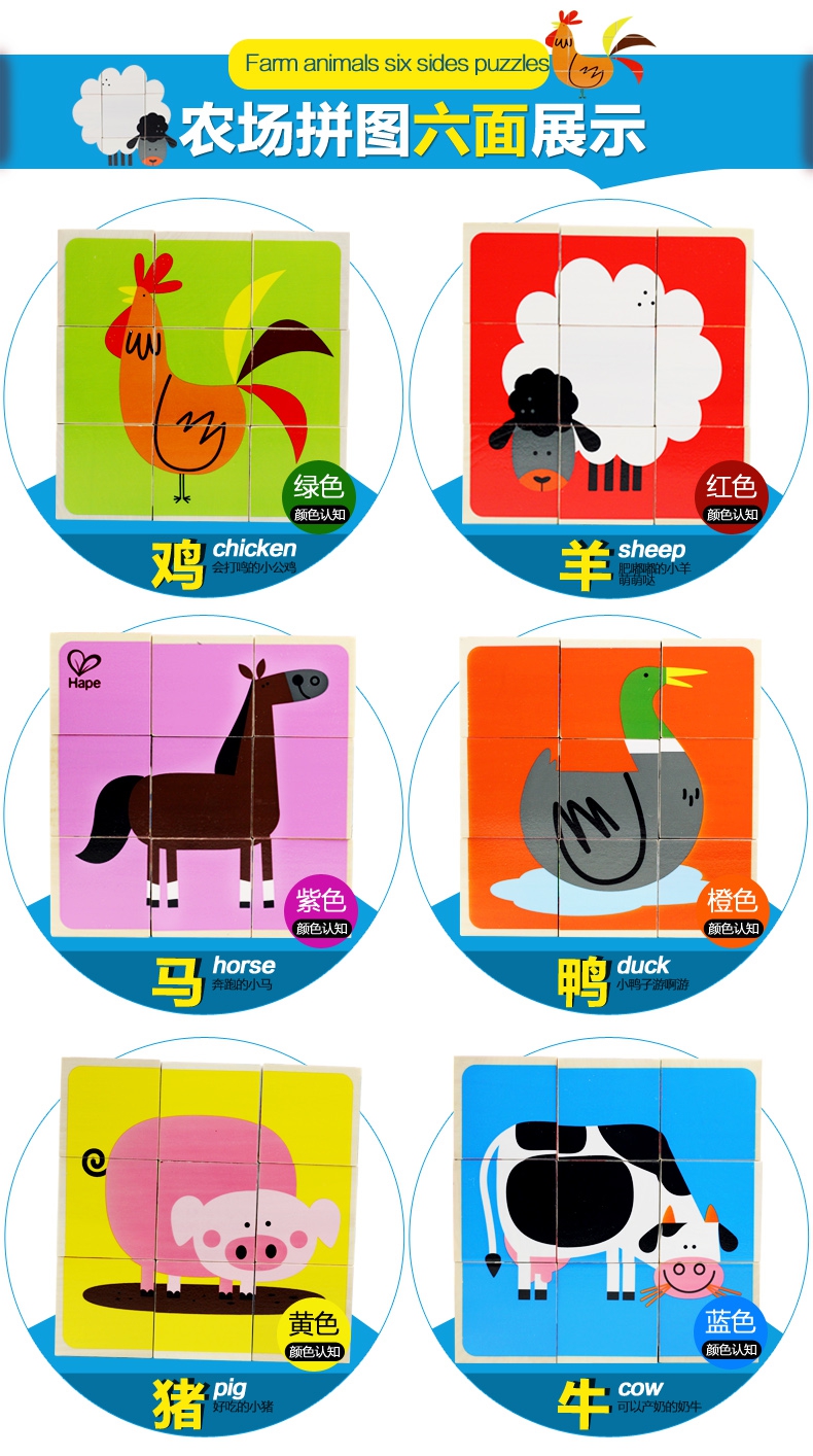 玩具特色:六面积木块拼图可以让孩子创造出熟悉的农场动物,
